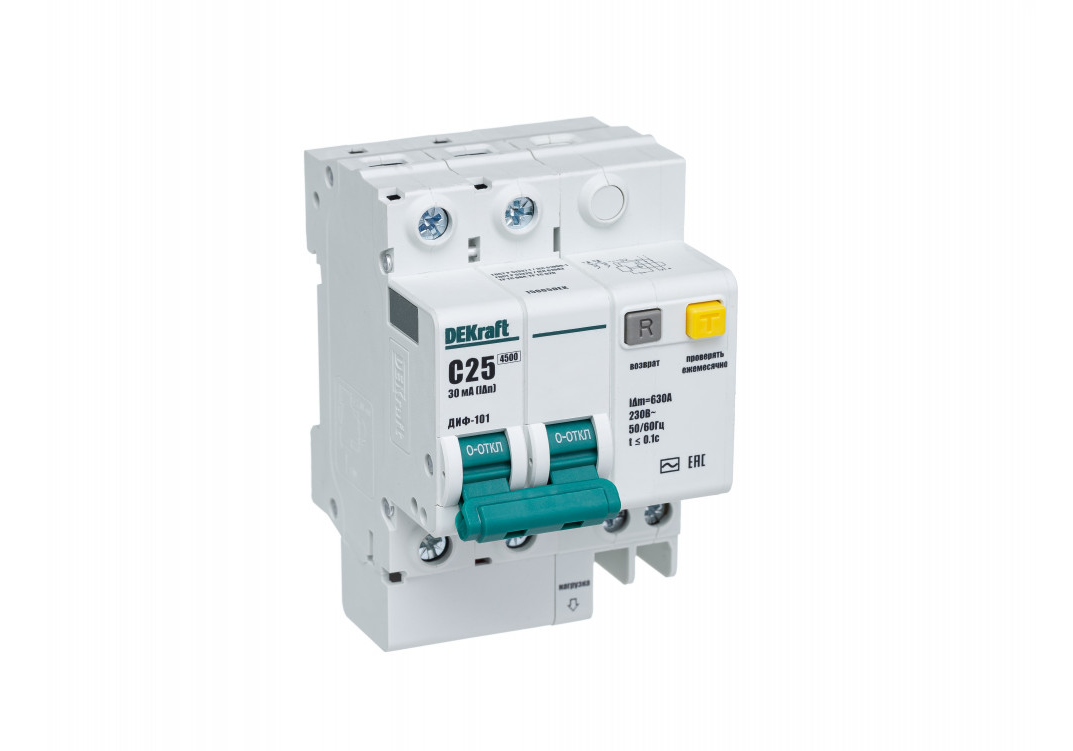 Автоматический выключатель дифференциального тока серии ДИФ-101 Dekraft; 2P; ном.ток 25 А; характеристика C; откл.способность Icn = 4,5 kA; ток утечки 30 мА; блок дифф.защиты – электронный; ширина – 3,5 мод. х 18 мм; монтаж – на DIN-рейку. АВДТ серии ДИФ-101 применяются в сетях напряжением до 400 В пер.тока для защиты человека от поражения электрическим током и электроустановок от сверхтоков и токов утечки. Для расширения функционала АВДТ возможно использование аксессуаров от выключателей серии ВА-101.