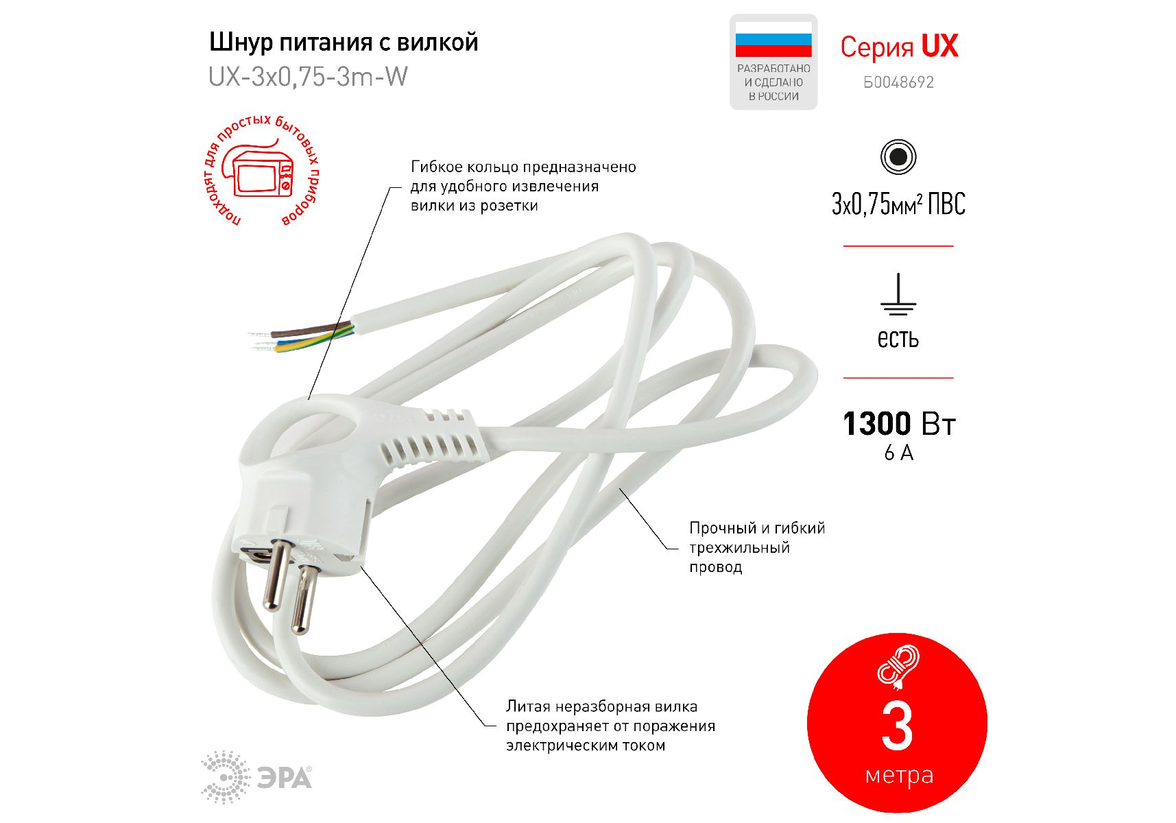 Шнур сетевой с вилкой Эра UX-3x0,75-3m -W Б0048692