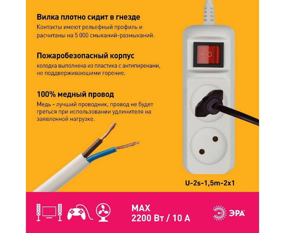Удлинитель электрический Эра U-2s-1,5m-2x1 Б0044046