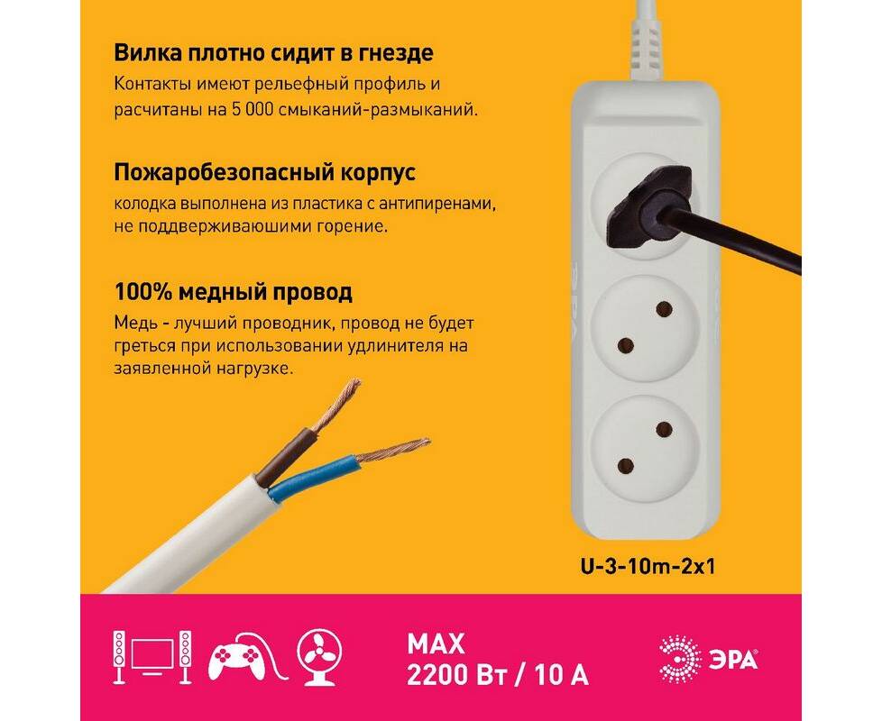 Удлинитель электрический Эра U-3-10m-2x1 Б0028358