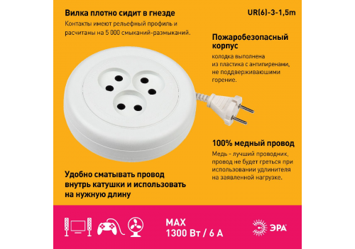 Удлинитель электрический Эра UR(6)-3-1,5m Б0035761