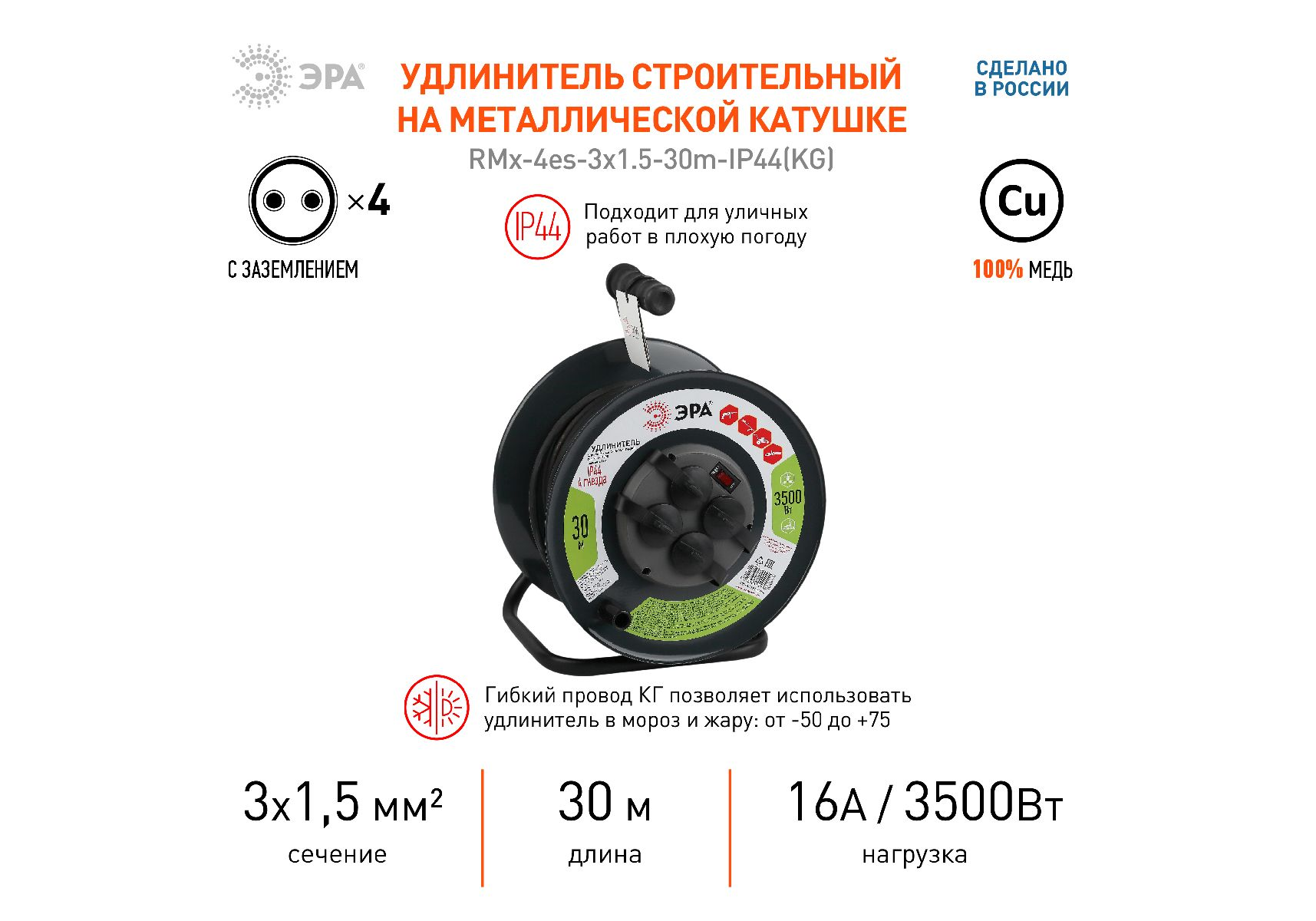 Удлинитель силовой Эра RMx-4es-3x1.5-30m-IP44(KG) Б0046844