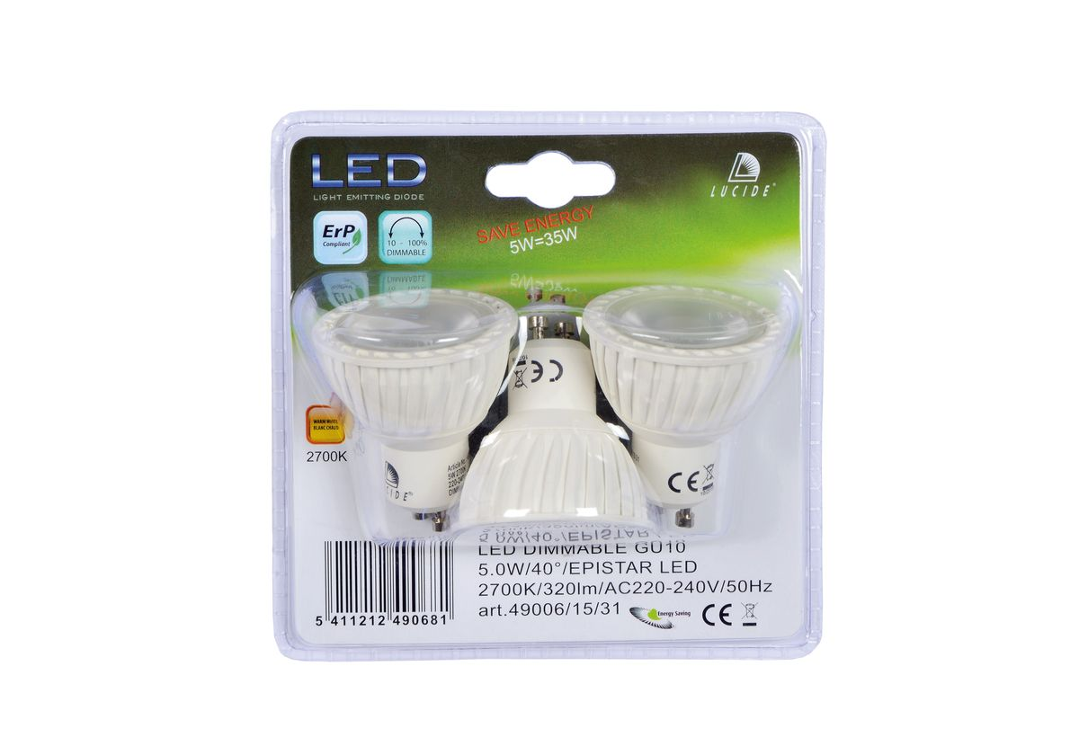 Лампа светодиодная диммируемая Lucide GU10 5W 3000K белая (3 шт.) 49006/15/31