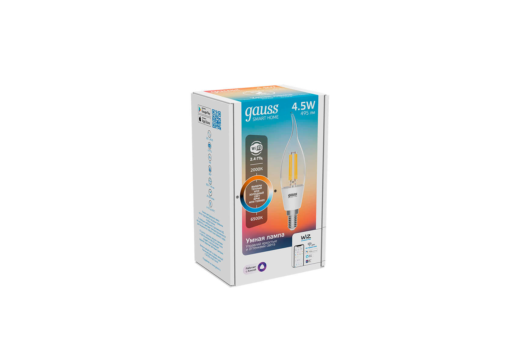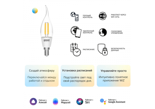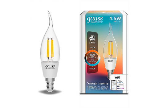 Лампа светодиодная диммируемая филаментная Gauss Smart Home Filament E14 4,5W 2000-6500K прозрачная 1280112