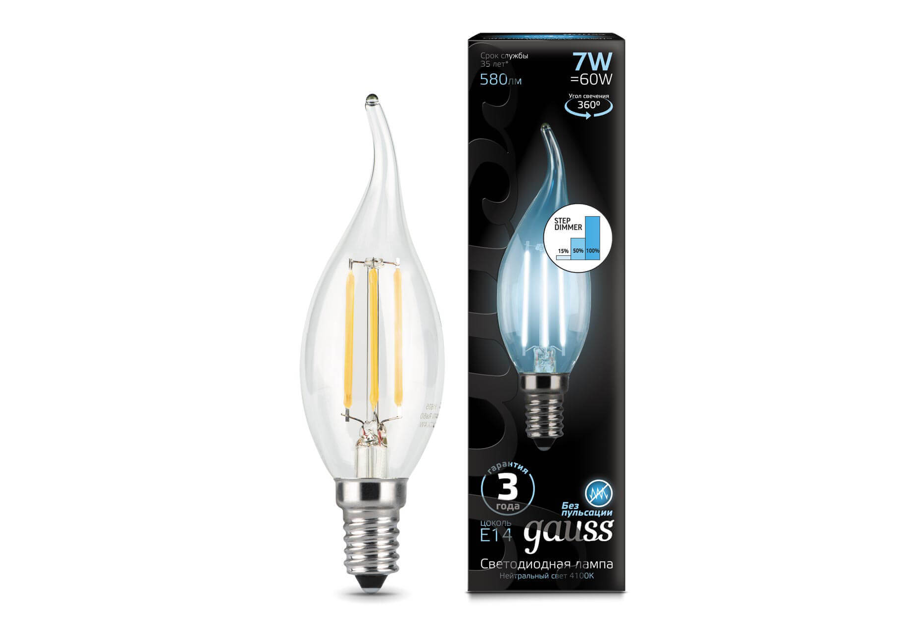 Лампа светодиодная филаментная диммируемая Gauss E14 7W 4100K прозрачная 104801207-S