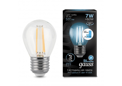Лампа светодиодная филаментная диммируемая Gauss E27 7W 4100K прозрачная 105802207-S