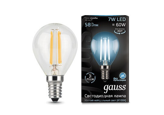 Лампа светодиодная филаментная Gauss E14 7W 4100К прозрачная 105801207