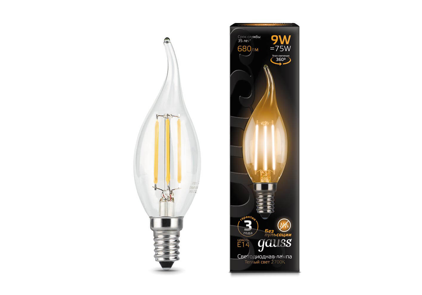 Лампа светодиодная филаментная Gauss E14 9W 2700К прозрачная 104801109