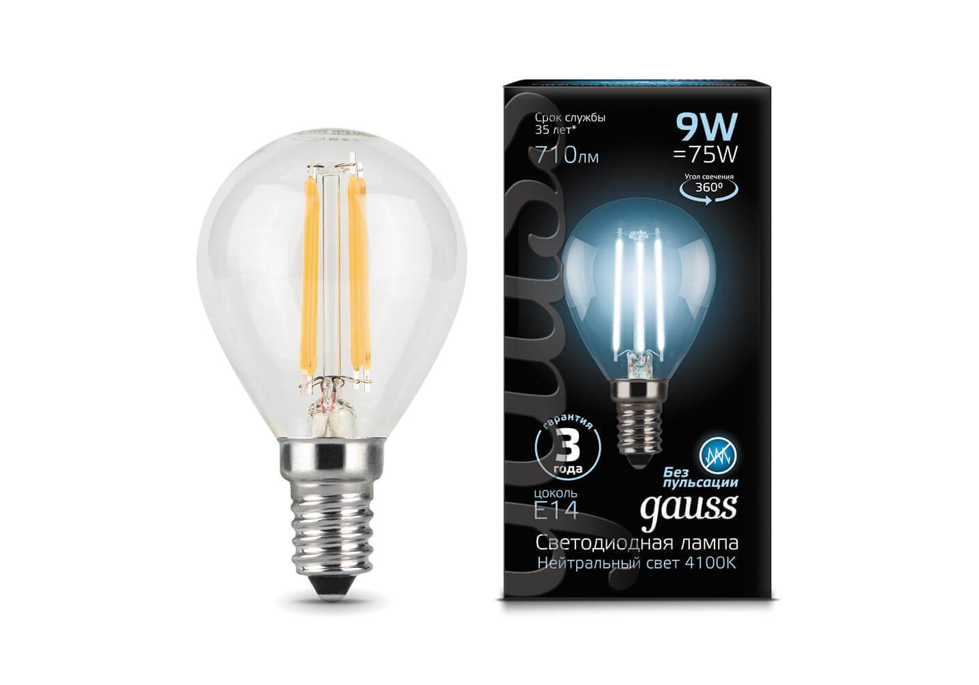 Лампа светодиодная филаментная Gauss E14 9W 4100К прозрачная 105801209
