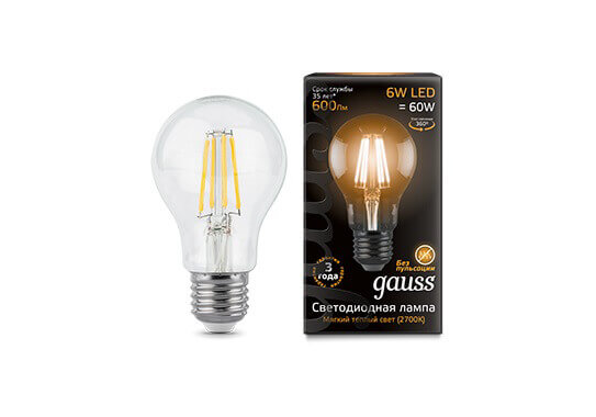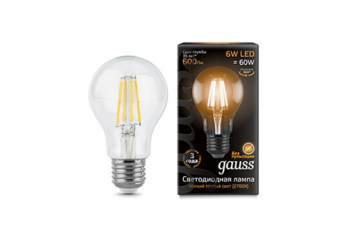 Лампа светодиодная филаментная Gauss E27 6W 2700К прозрачная 1/10/50 102802106
