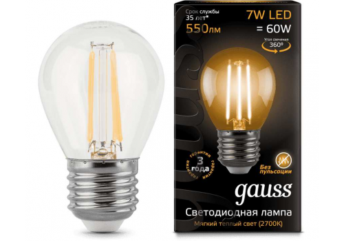 Лампа светодиодная филаментная Gauss E27 7W 2700К прозрачная 105802107