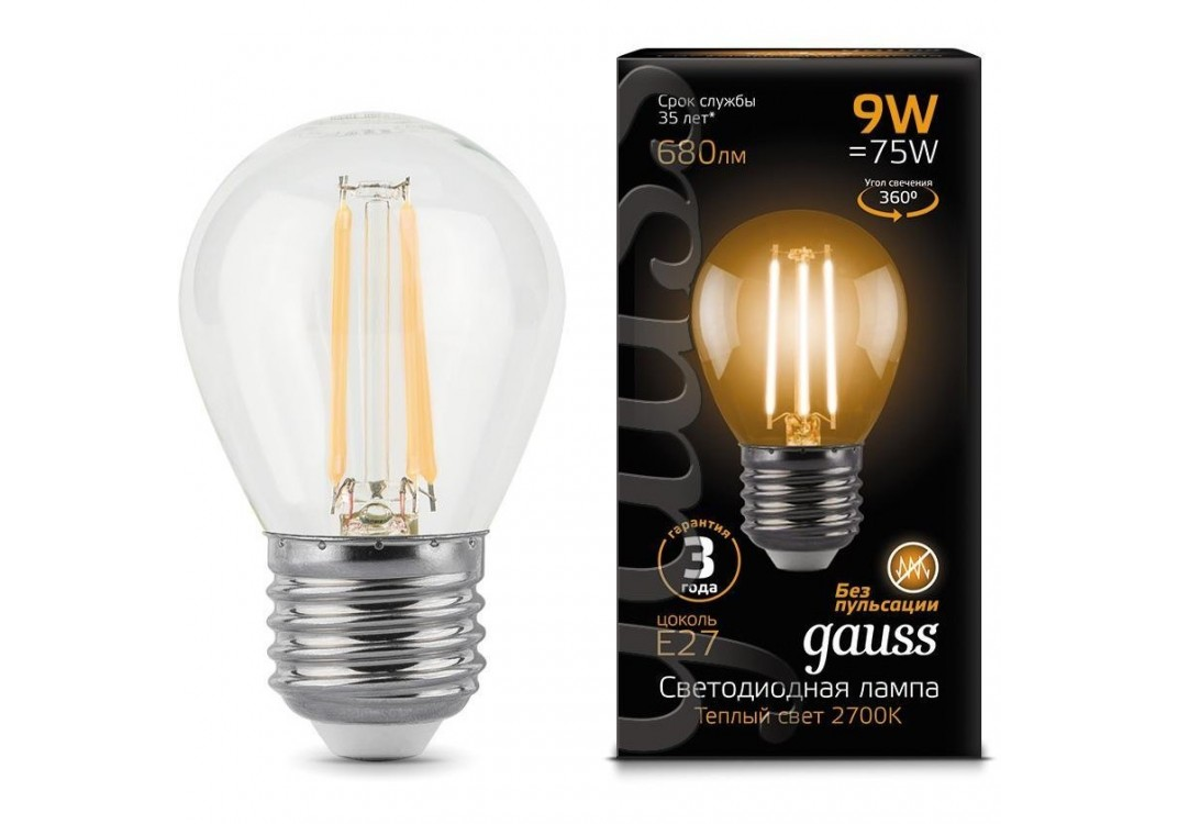 Лампа светодиодная филаментная Gauss E27 9W 2700K прозрачная 105802109