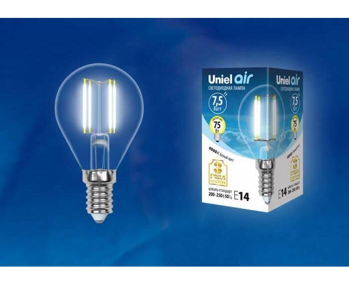 Лампа светодиодная филаментная (UL-00003254) Uniel E14 7,5W 4000K прозрачная LED-G45-7,5W/NW/E14/CL