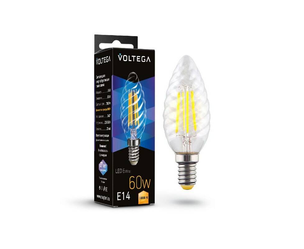 Лампа светодиодная филаментная Voltega E14 6W 3000K свеча витая прозрачная 7211