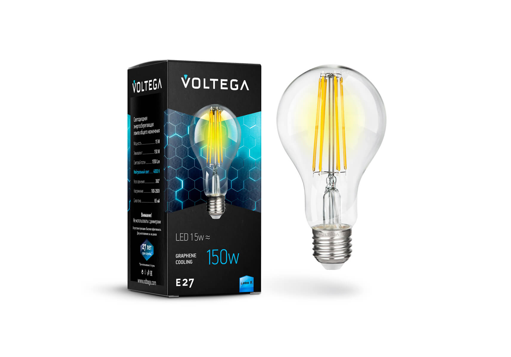 Лампа светодиодная филаментная Voltega E27 15W 4000К прозрачная VG10-A1E27cold15W-F 7103