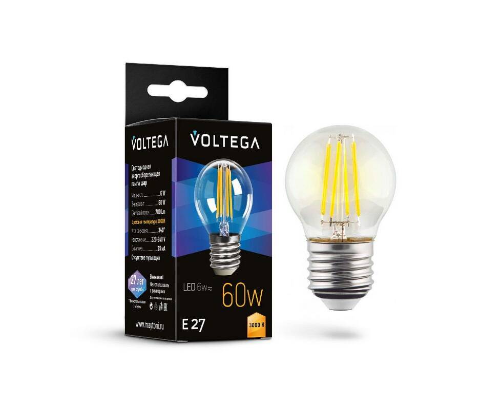 Лампа светодиодная филаментная Voltega E27 6W 3000K шар прозрачный 7215