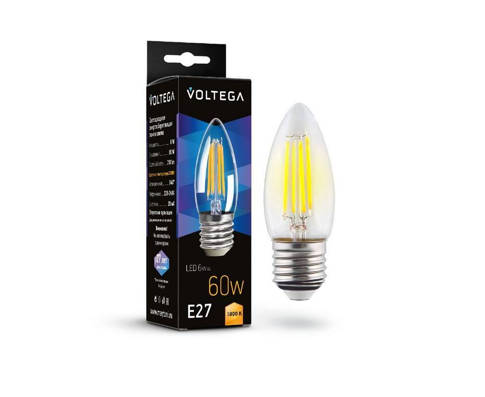 Лампа светодиодная филаментная Voltega E27 6W 3000K свеча прозрачная 7208