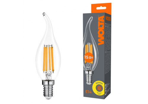 Лампа светодиодная филаментная WOLTA 15Вт 3000K Е14 свеча на ветру прозрачная WF-CT35-15W3KE14
