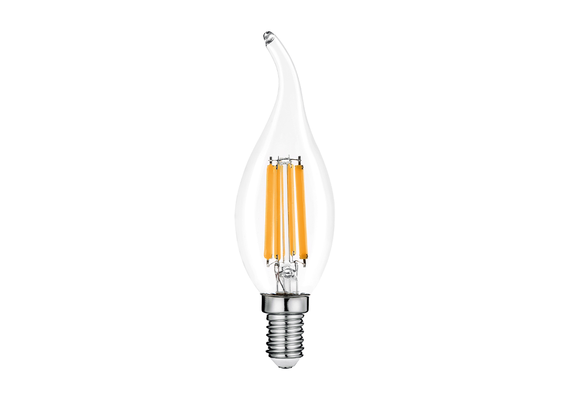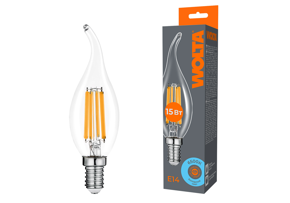 Лампа светодиодная филаментная WOLTA 15Вт 6500K Е14 свеча на ветру прозрачная WF-CT35-15W6KE14