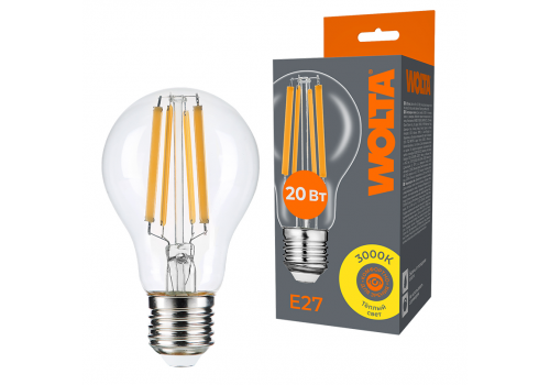 Лампа светодиодная филаментная WOLTA 20Вт 3000K Е27 груша прозрачная WF-A60-20W3KE27