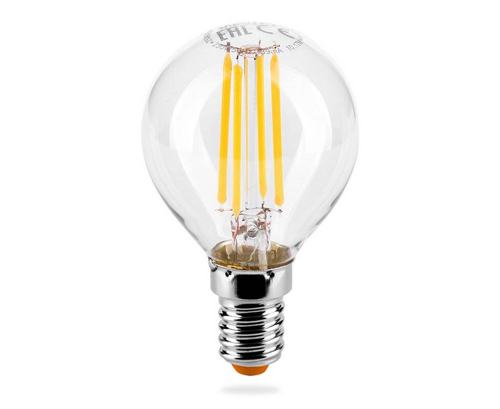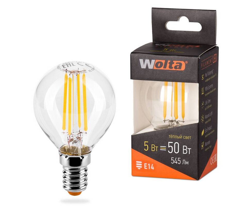 Лампа светодиодная филаментная WOLTA 5Вт 3000K Е14 шар прозрачный 25Y45GLFT5E14