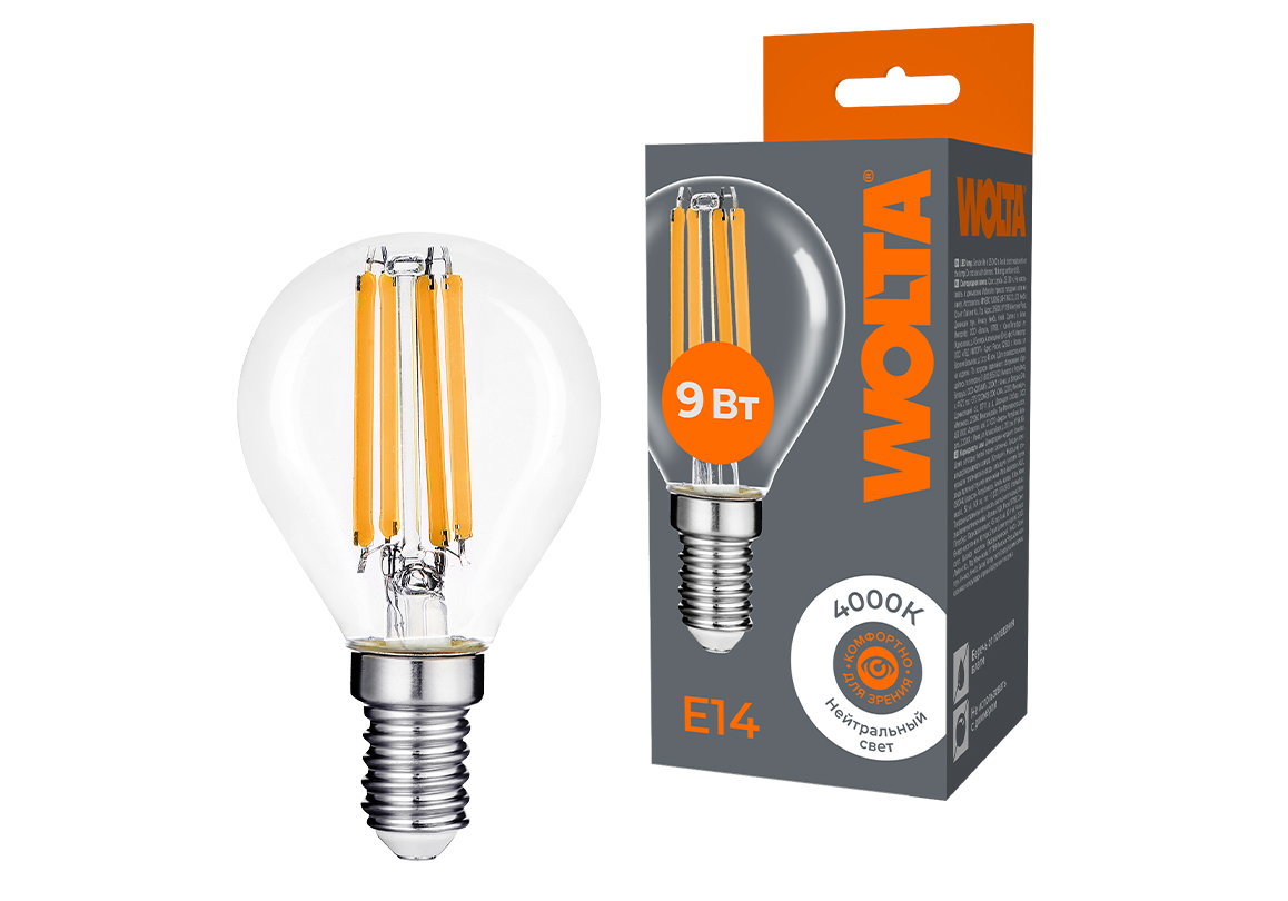Лампа светодиодная филаментная WOLTA 9Вт 4000K Е14 шар прозрачный WF-G45-9W4KE14