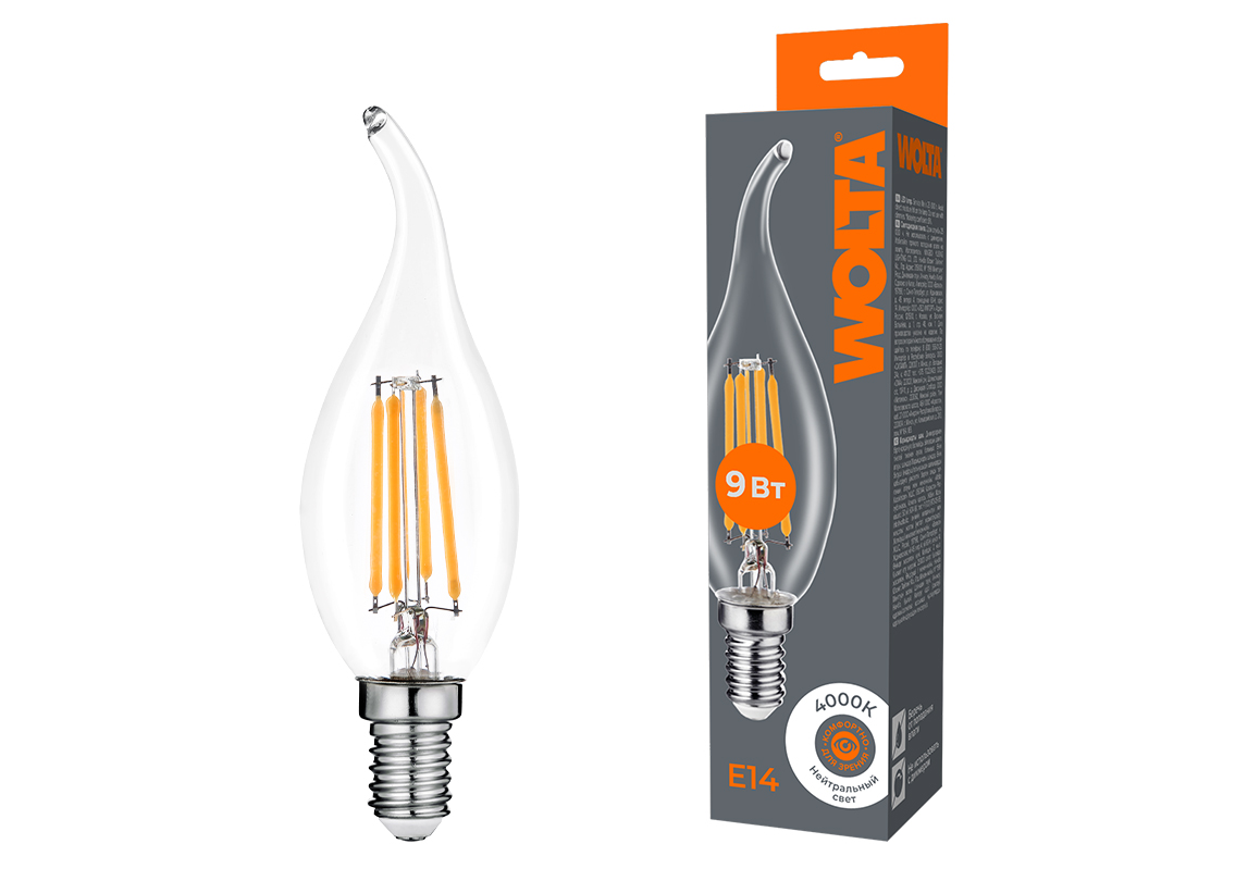 Лампа светодиодная филаментная WOLTA 9Вт 4000K Е14 свеча на ветру прозрачная WF-CT35-9W4KE14