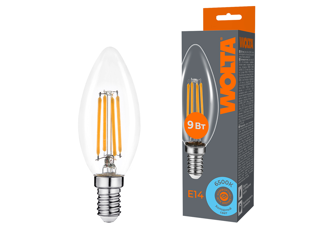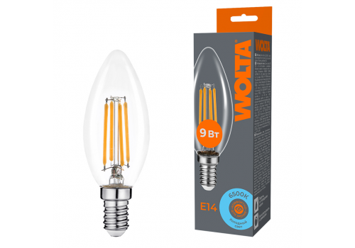 Лампа светодиодная филаментная WOLTA 9Вт 6500K Е14 свеча прозрачная WF-C35-9W6KE14