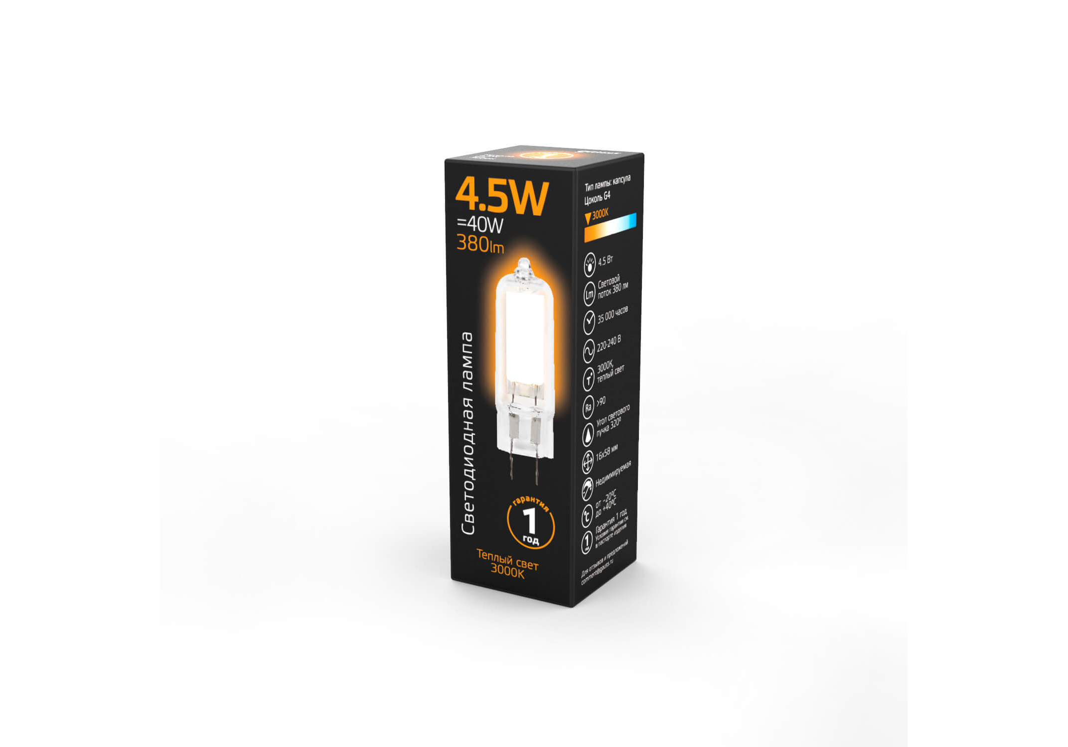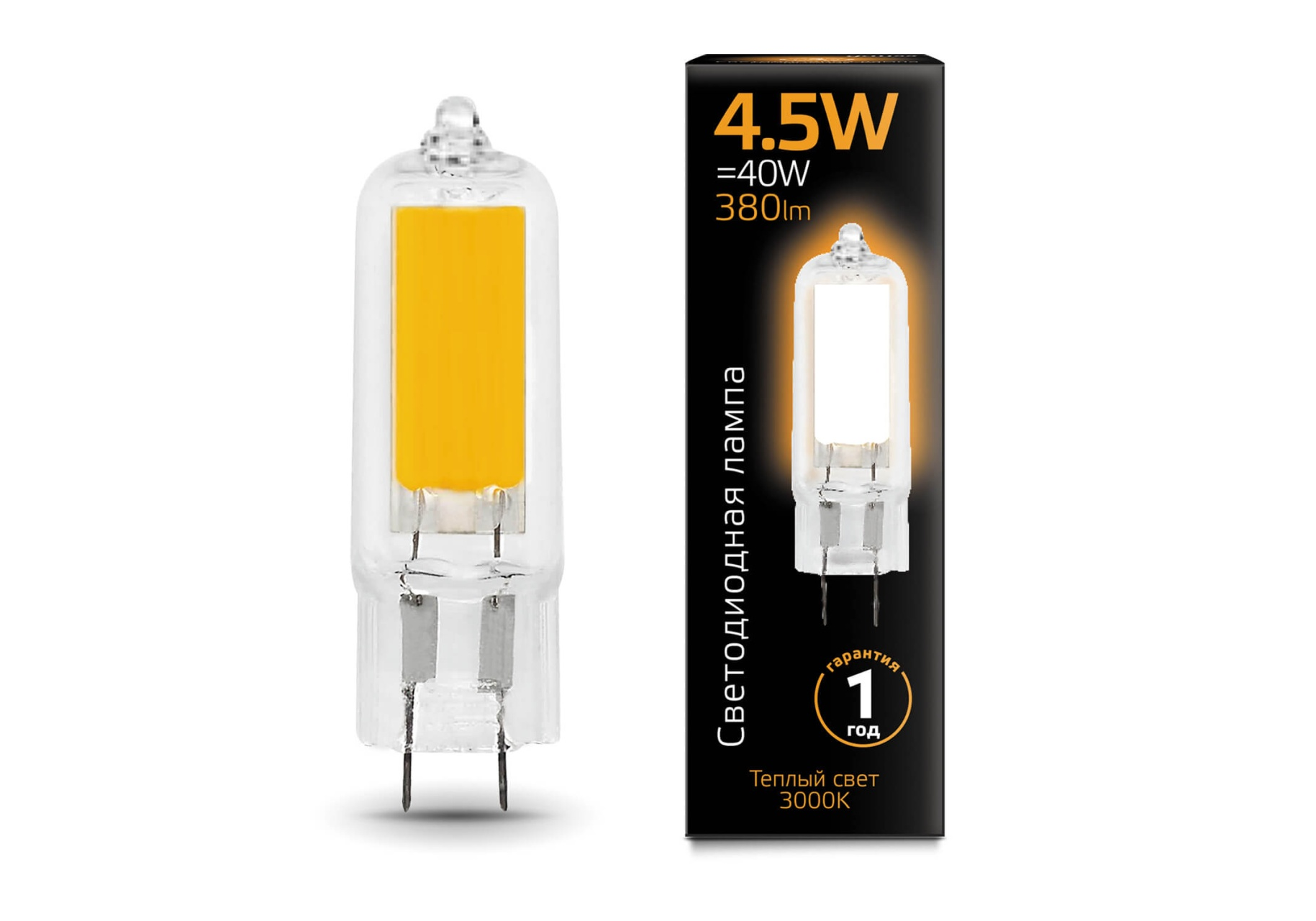 Лампа светодиодная Gauss G4 4.5W 3000K прозрачная 107807104