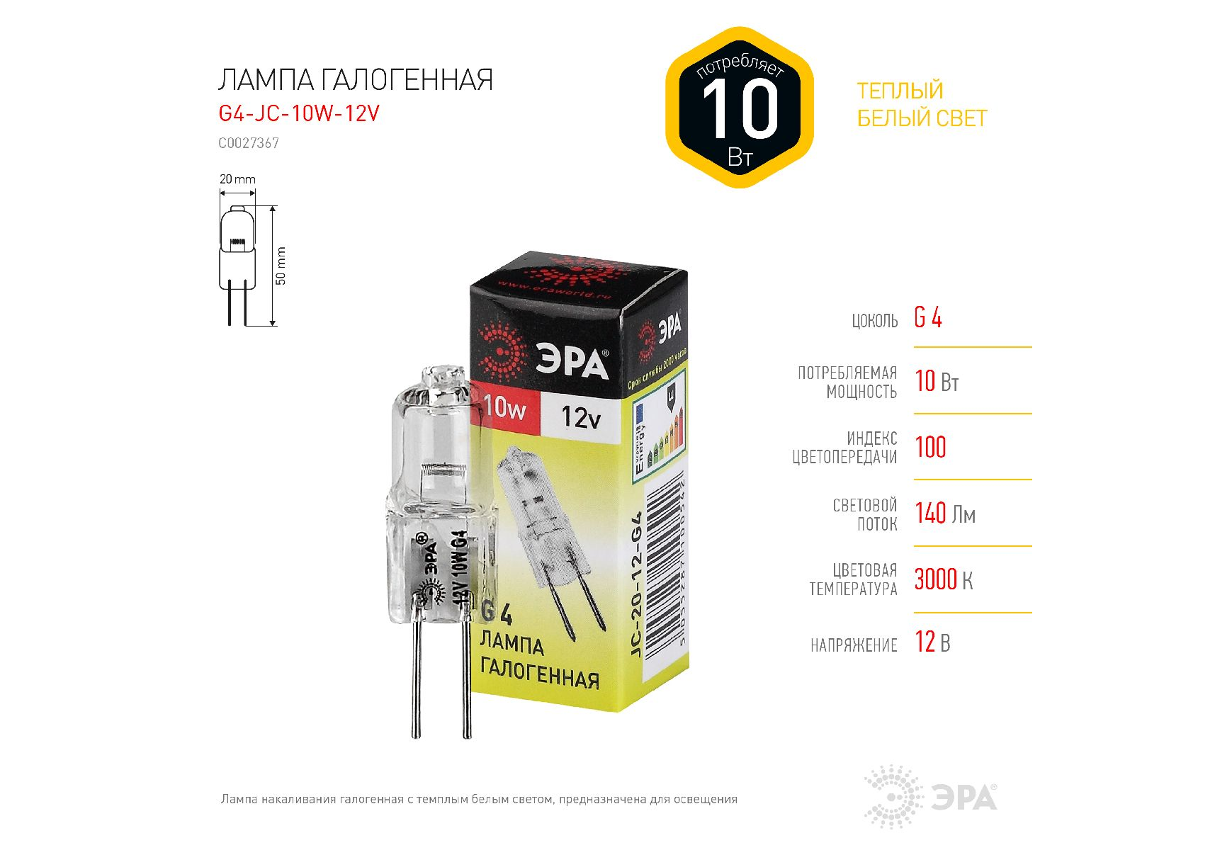 Лампа галогенная Эра G4 10W 3000K G4-JC-10W-12V C0027367