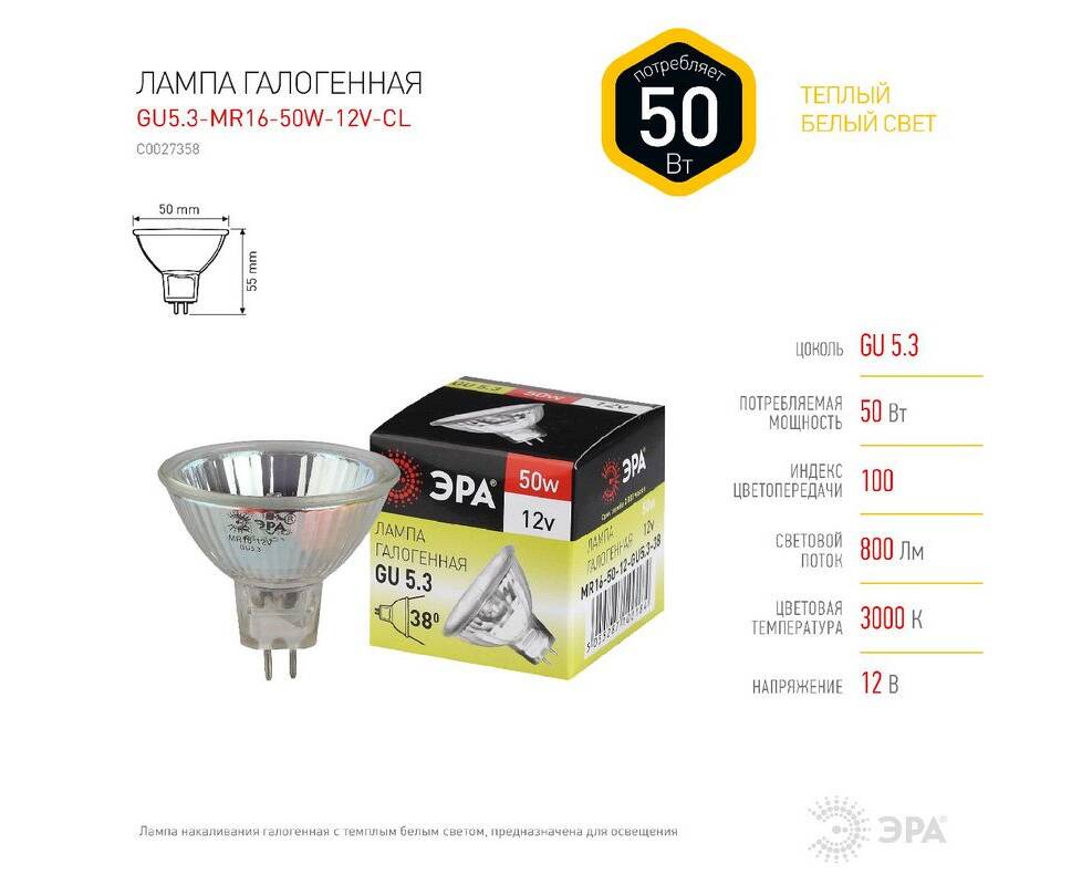 Лампа галогенная Эра GU5.3 50W 3000K GU5.3-MR16-50W-12V-CL C0027358