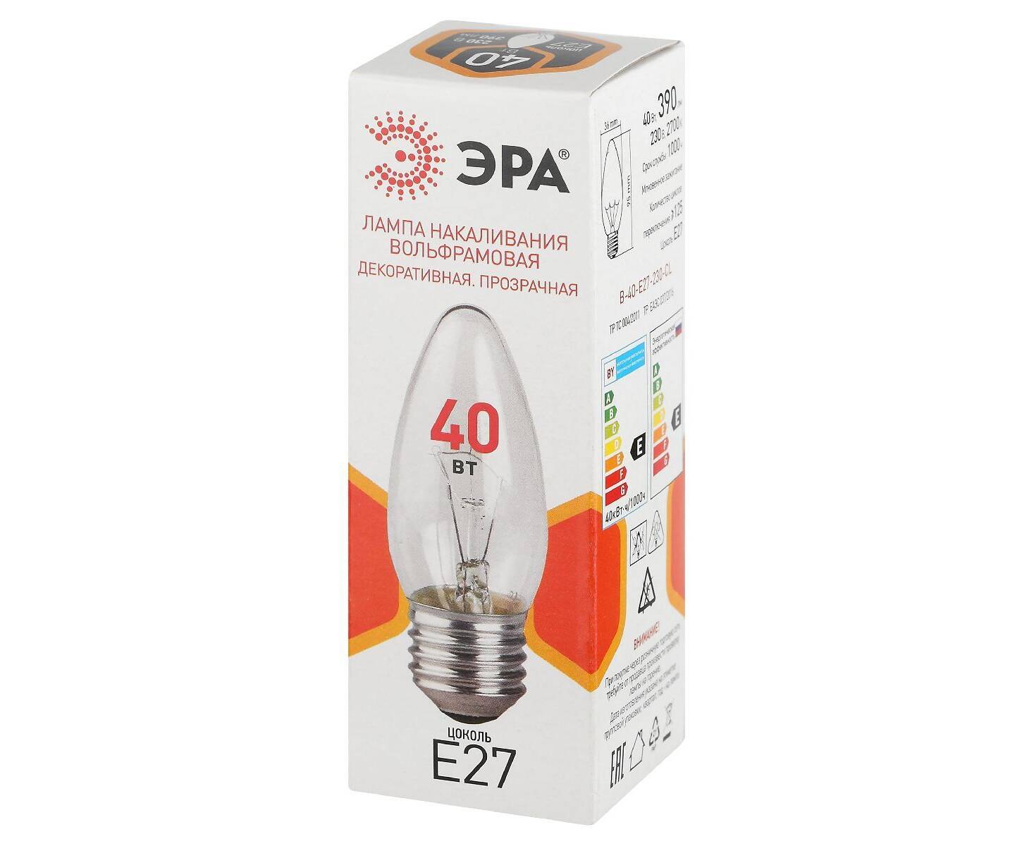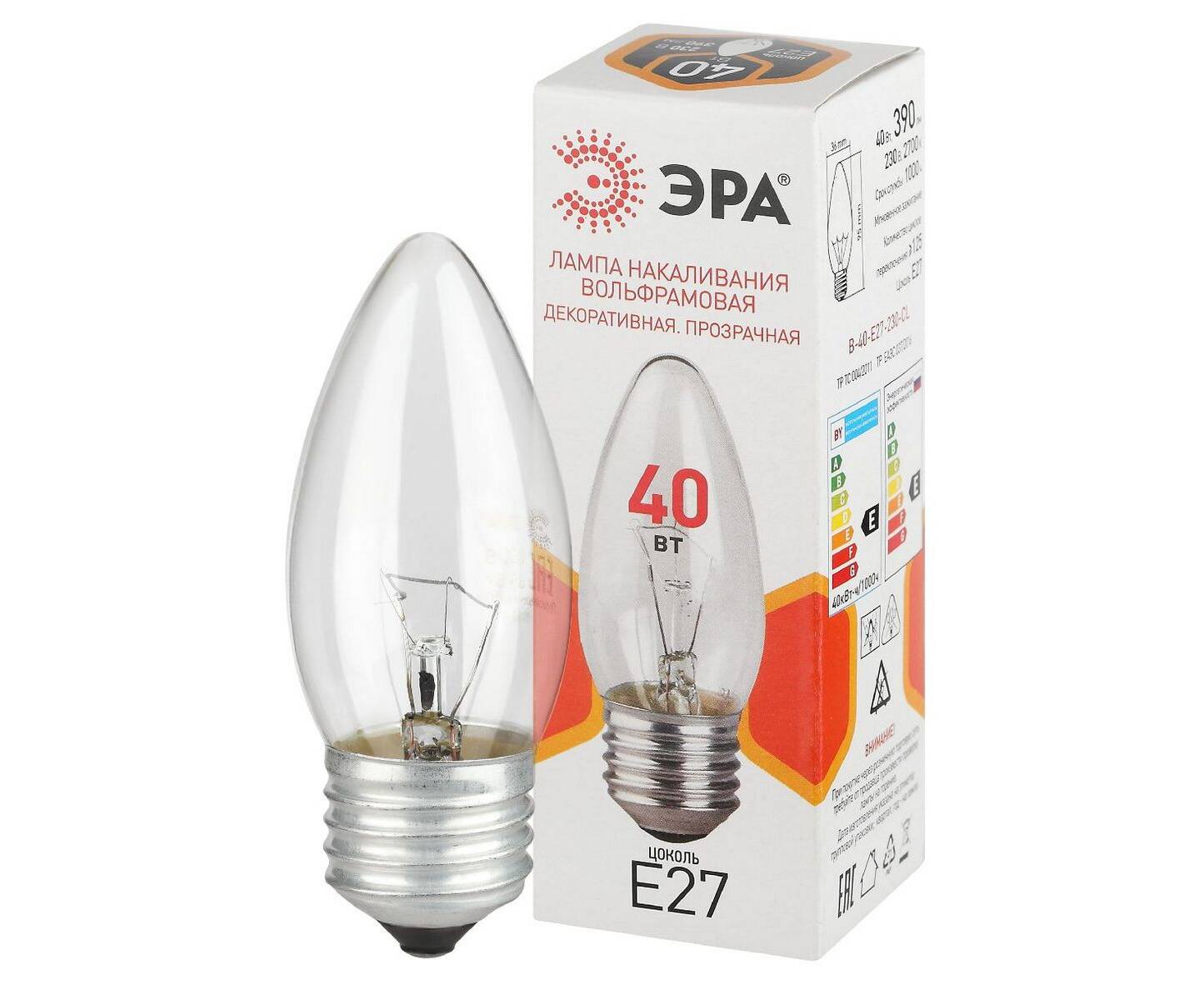 Лампа накаливания Эра B-40-E27-230-CL свечка Б0066505