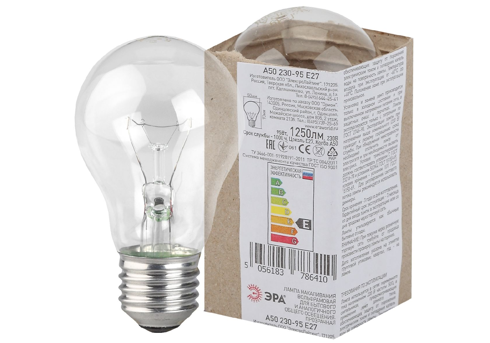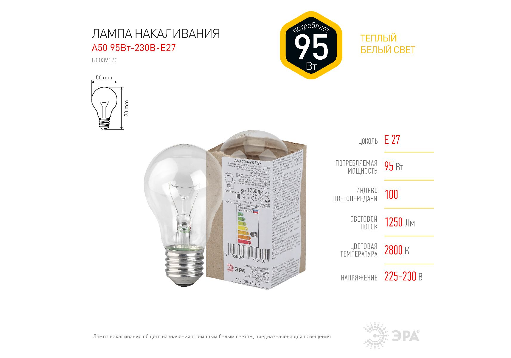 Лампа накаливания Эра E27 95W A50 95-230-Е27 (гофра) Б0039120