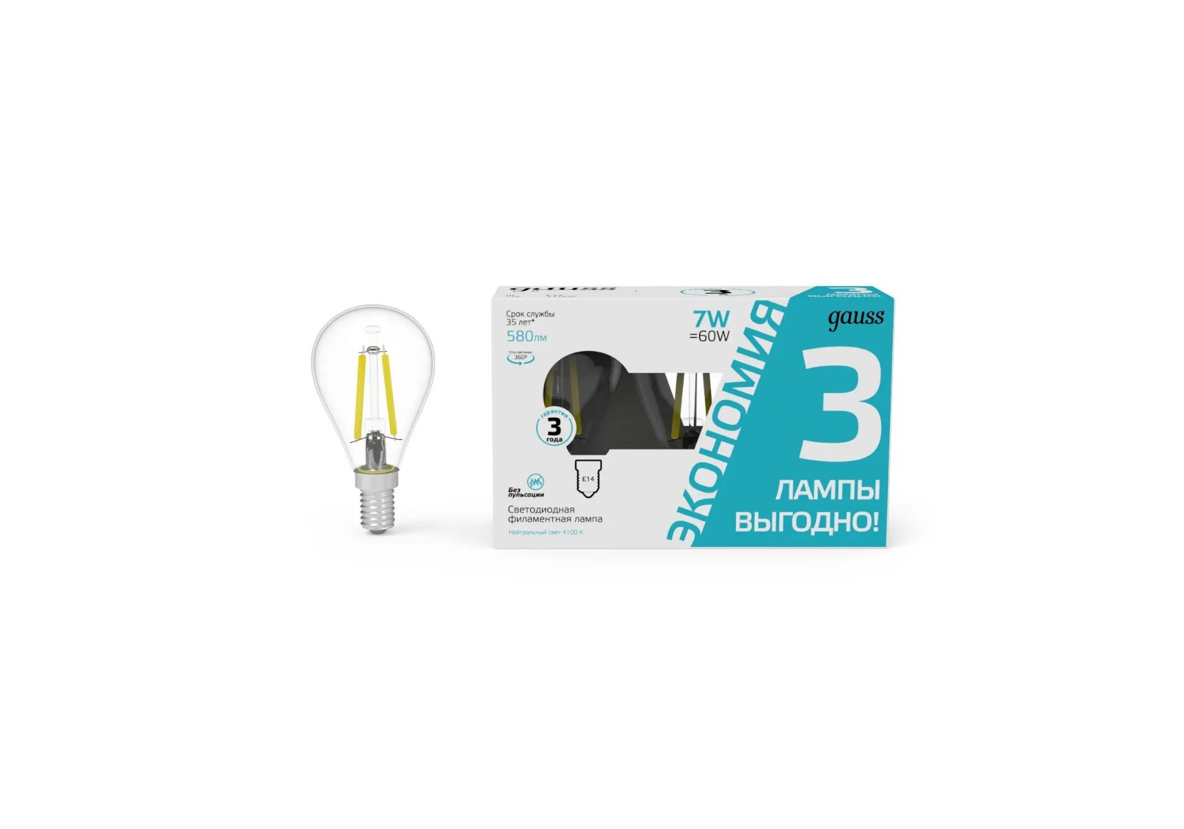 Лампа cветодиодная филаментная Gauss E14 7W 4100K прозрачная 3 шт. 105901207T