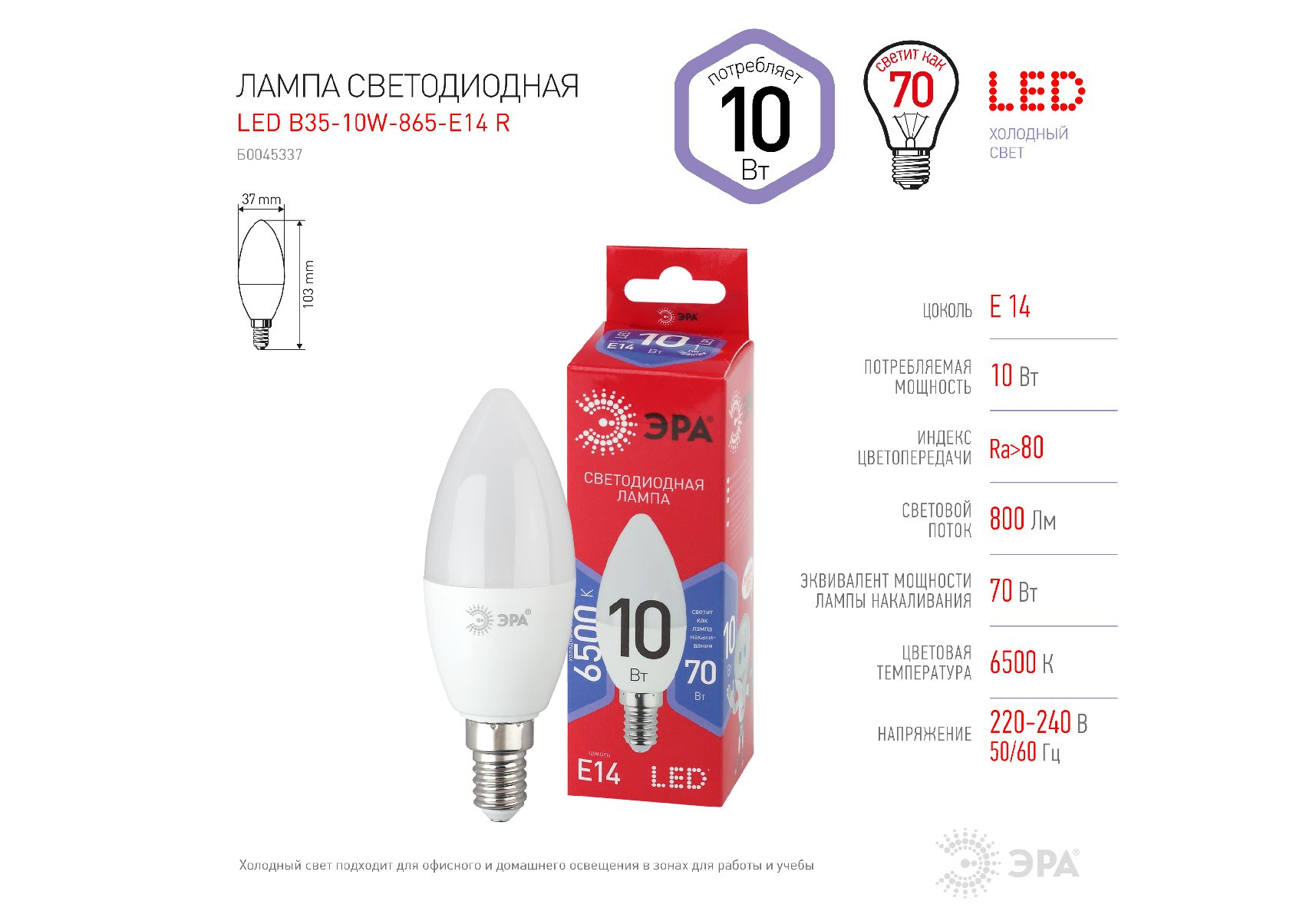 Лампа светодиодная Эра E14 10W 6500K LED B35-10W-865-E14 R Б0045337