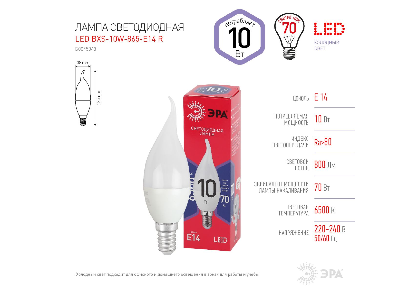 Лампа светодиодная Эра E14 10W 6500K LED BXS-10W-865-E14 R Б0045343