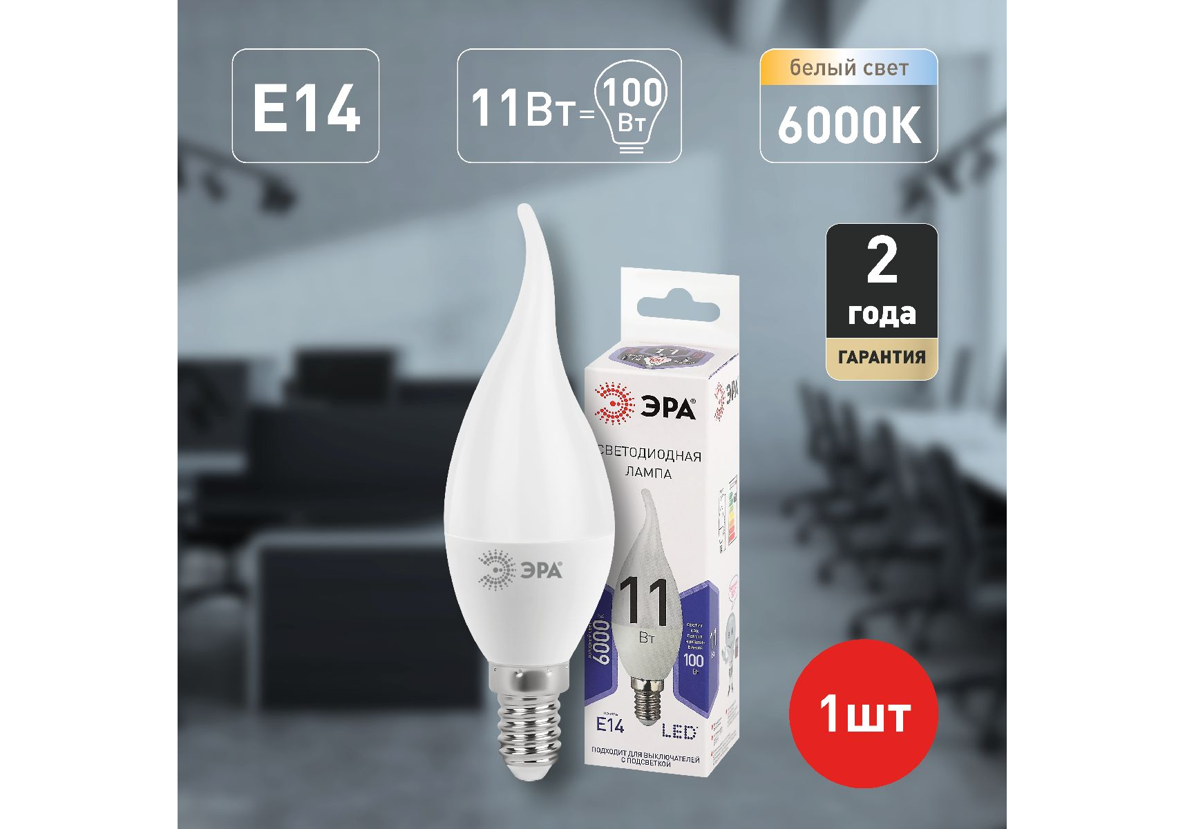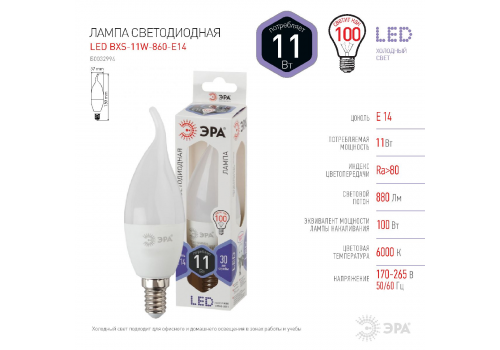 Лампа светодиодная Эра E14 11W 6000K LED BXS-11W-860-E14 Б0032994