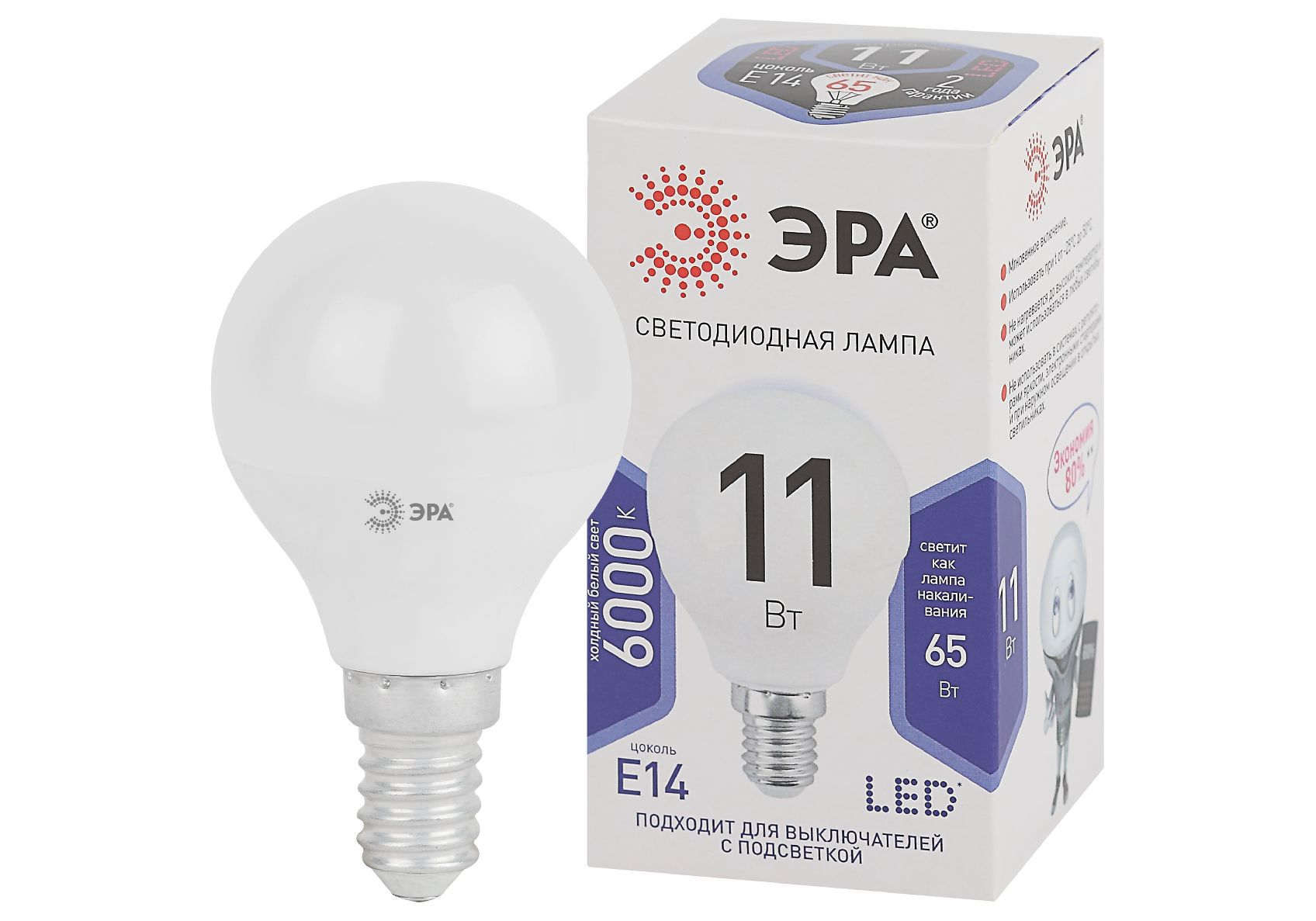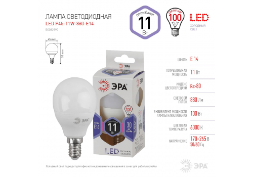 Лампа светодиодная Эра E14 11W 6000K LED P45-11W-860-E14 Б0032990