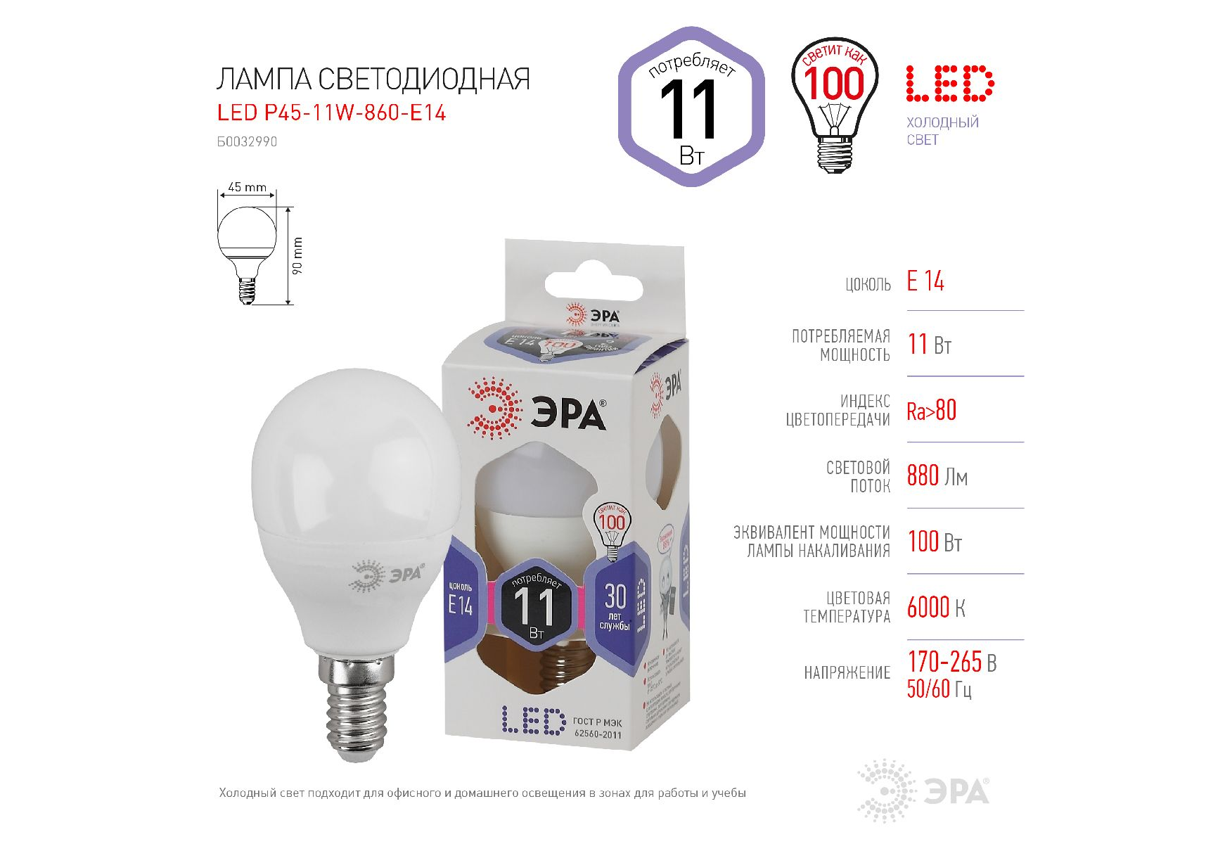 LED P45-11W-860-E14