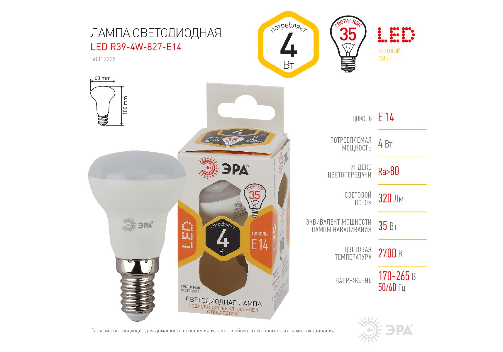 Лампа светодиодная Эра E14 4W 2700K LED R39-4W-827-E14 Б0017225