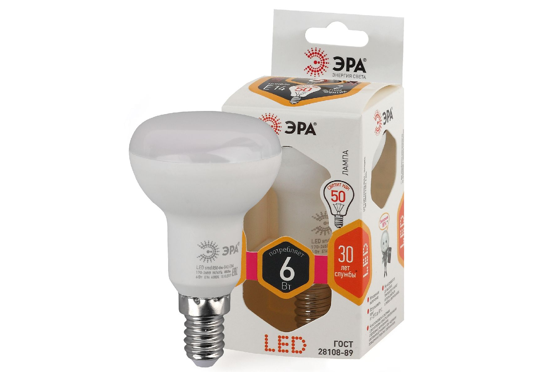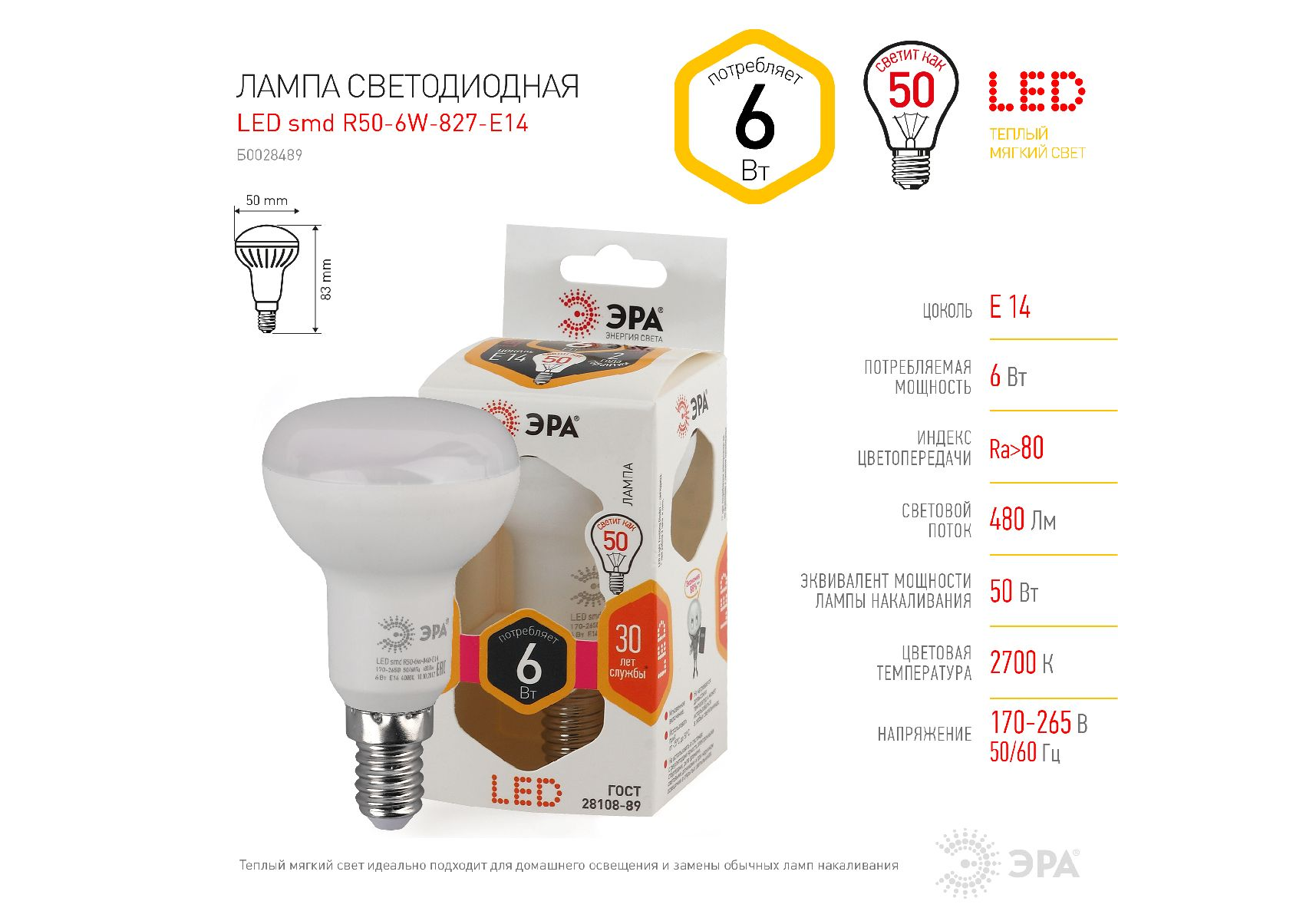 Лампа светодиодная Эра E14 6W 2700K LED R50-6W-827-E14 Б0028489
