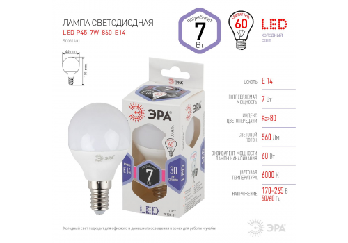 Лампа светодиодная Эра E14 7W 6000K LED P45-7W-860-E14 Б0031401
