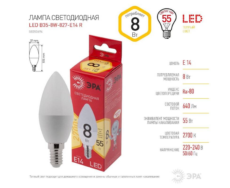 Лампа светодиодная Эра E14 8W 2700K LED B35-8W-827-E14 R Б0050694