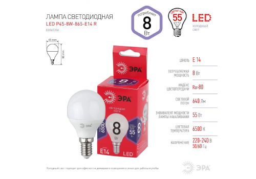 Лампа светодиодная Эра E14 8W 6500K LED P45-8W-865-E14 R Б0045358