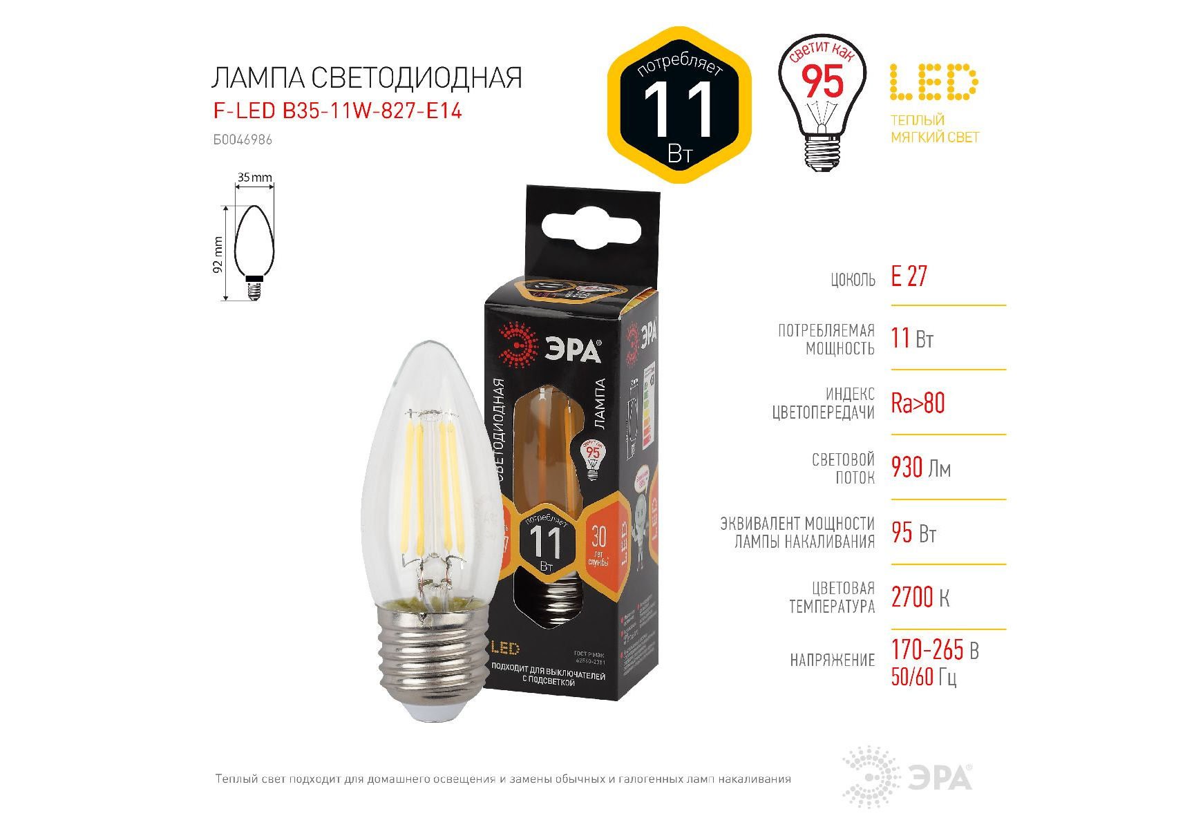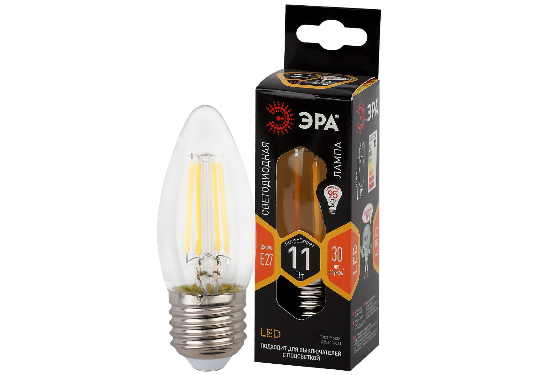 Лампа светодиодная Эра E27 11W 2700K F-LED B35-11w-827-E27 Б0046986