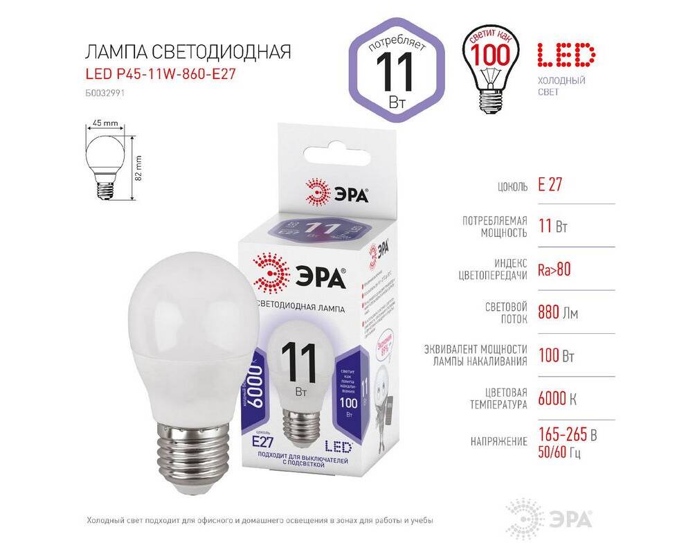 Лампа светодиодная Эра E27 11W 6000K LED P45-11W-860-E27 Б0032991