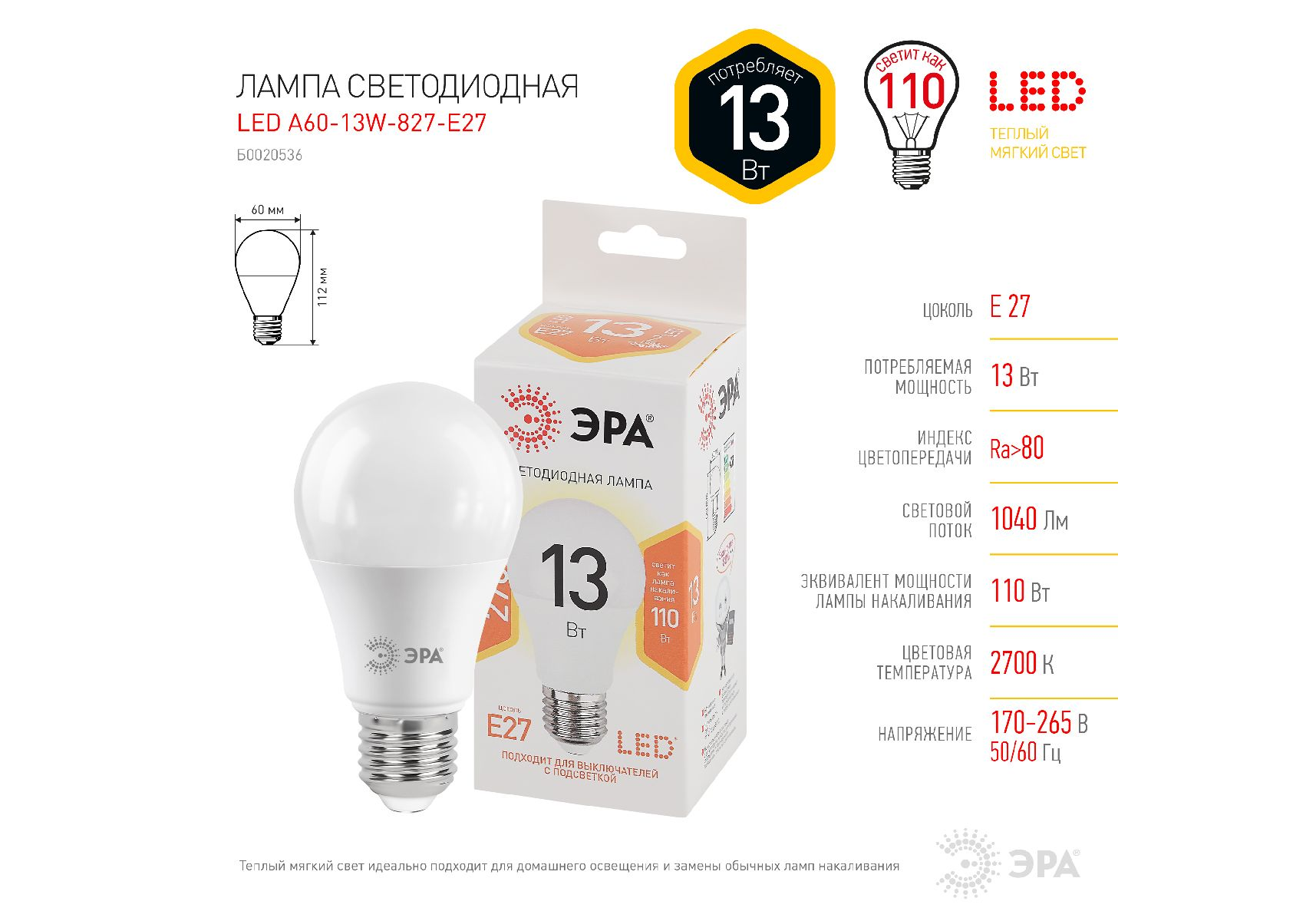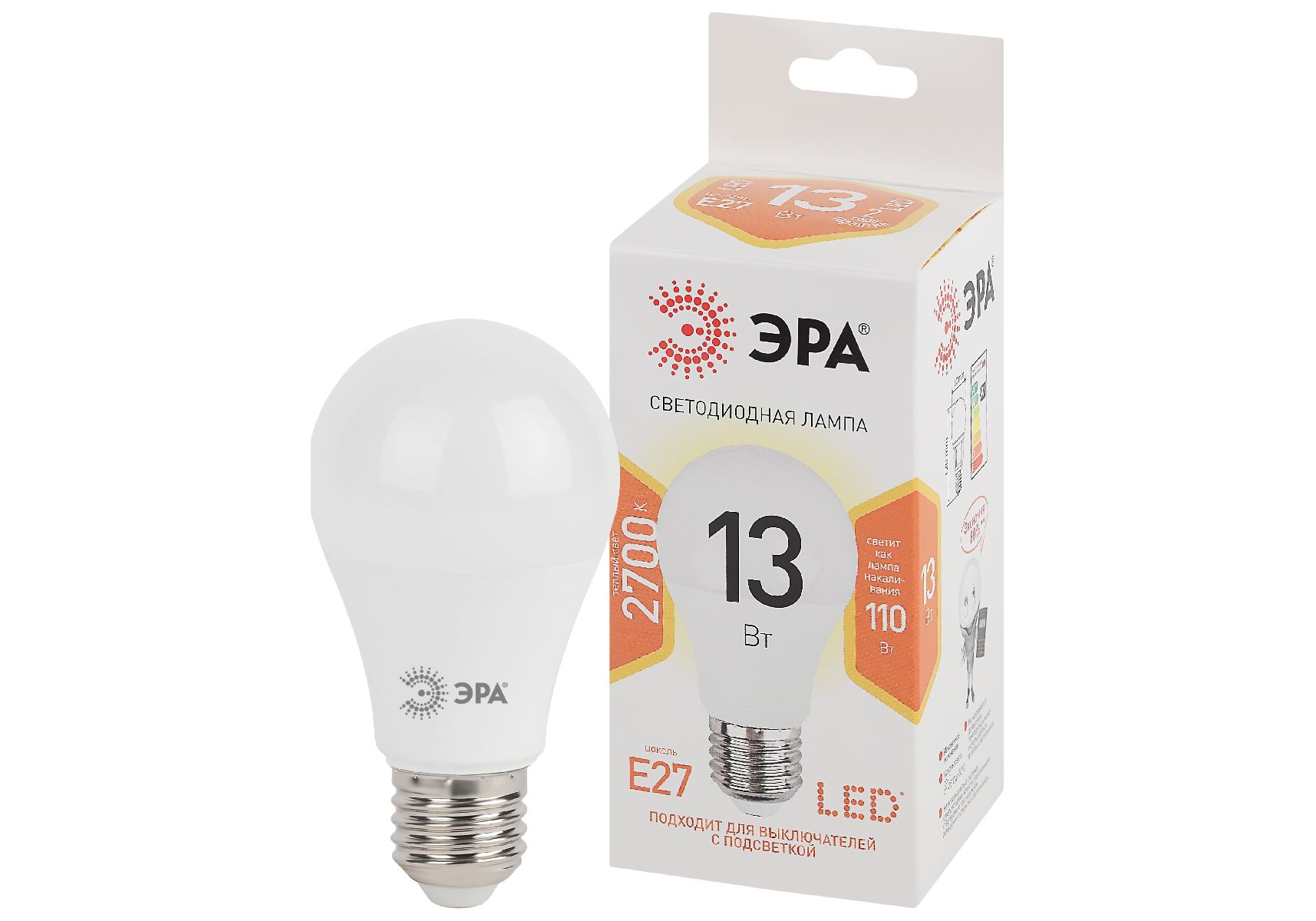 Лампа светодиодная Эра E27 13W 2700K LED A60-13W-827-E27 Б0020536