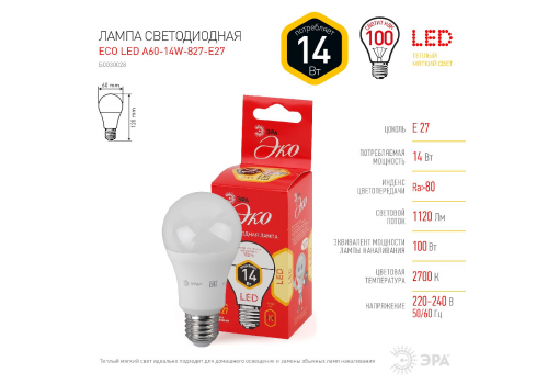 Лампа светодиодная Эра Е27 14W 2700K ECO LED A60-14W-827-E27 груша Б0030028