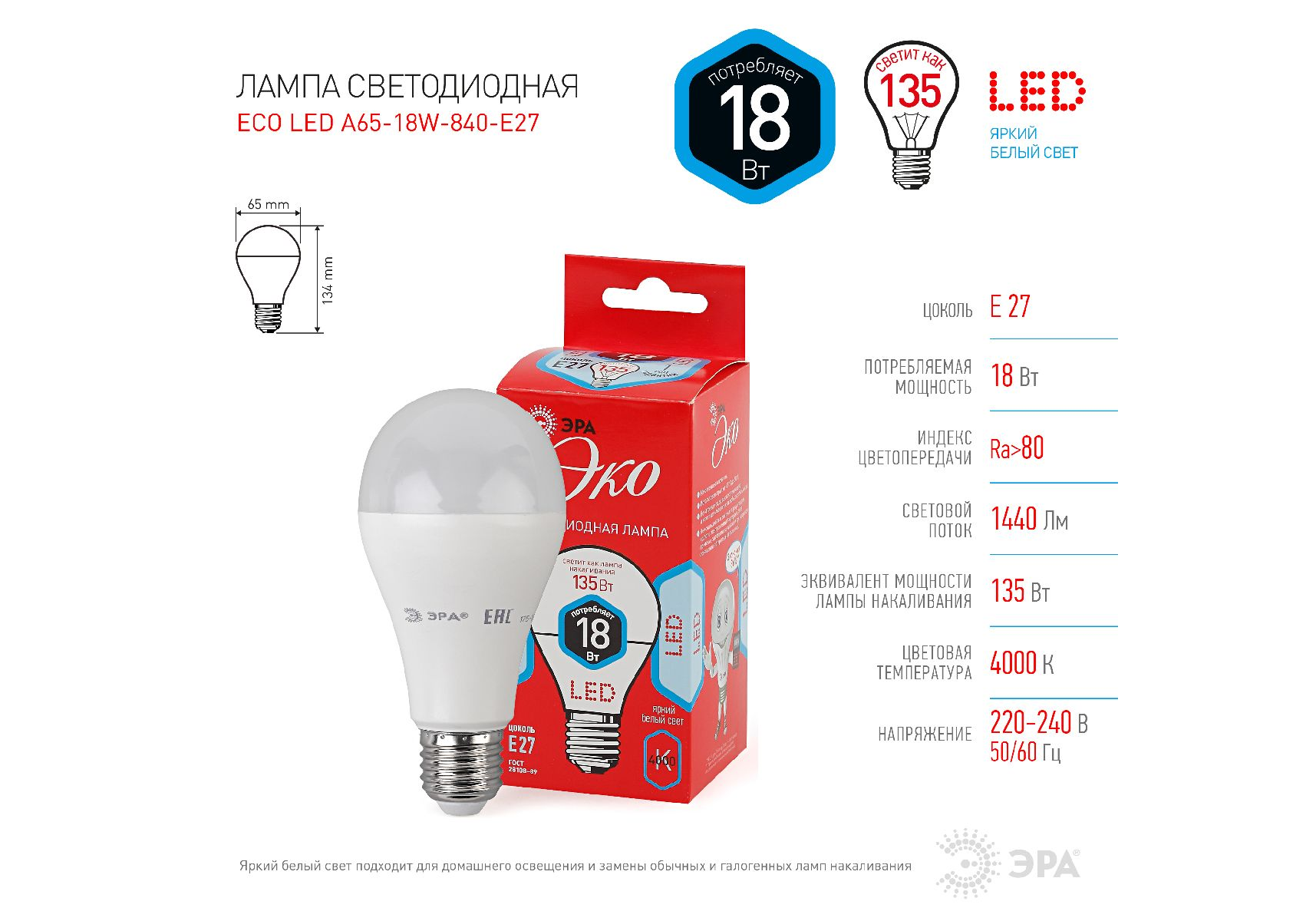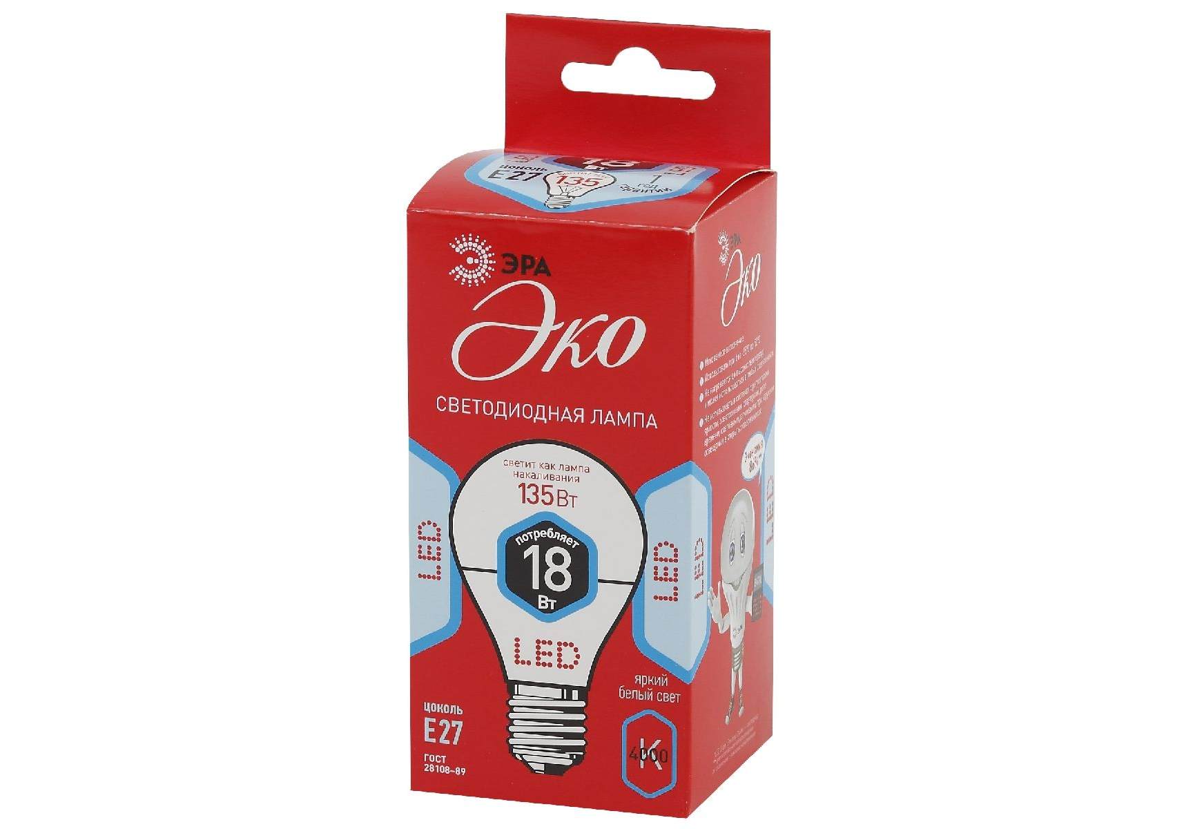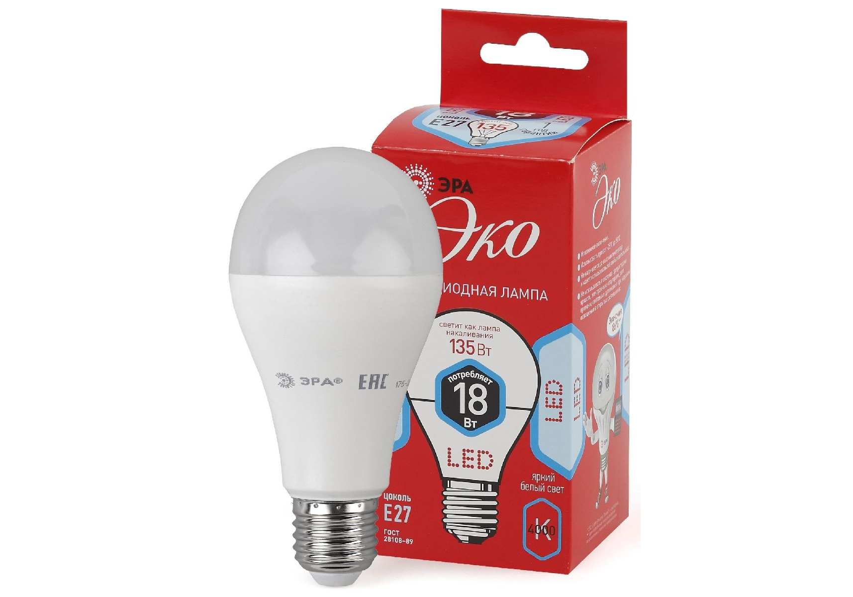 Лампа светодиодная Эра E27 18W 4000K ECO LED A65-18W-840-E27 Б0031708