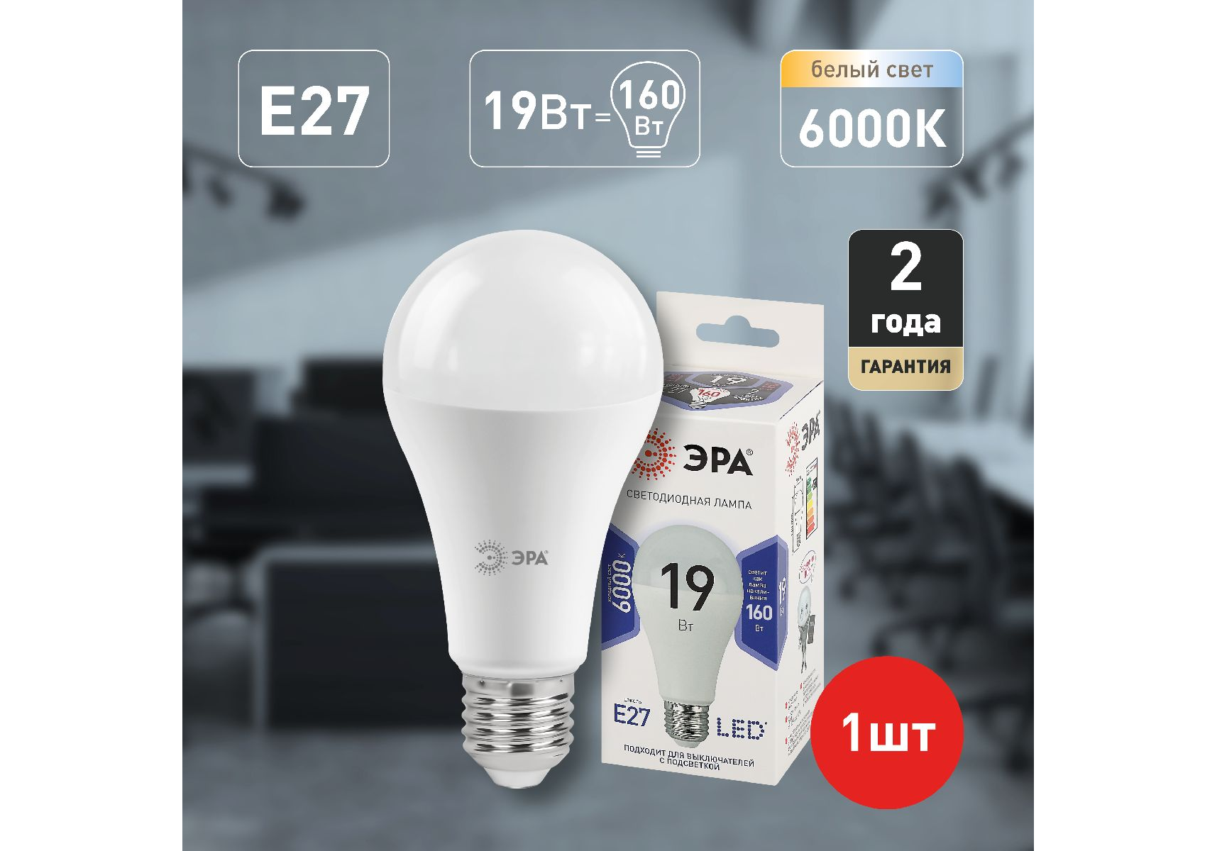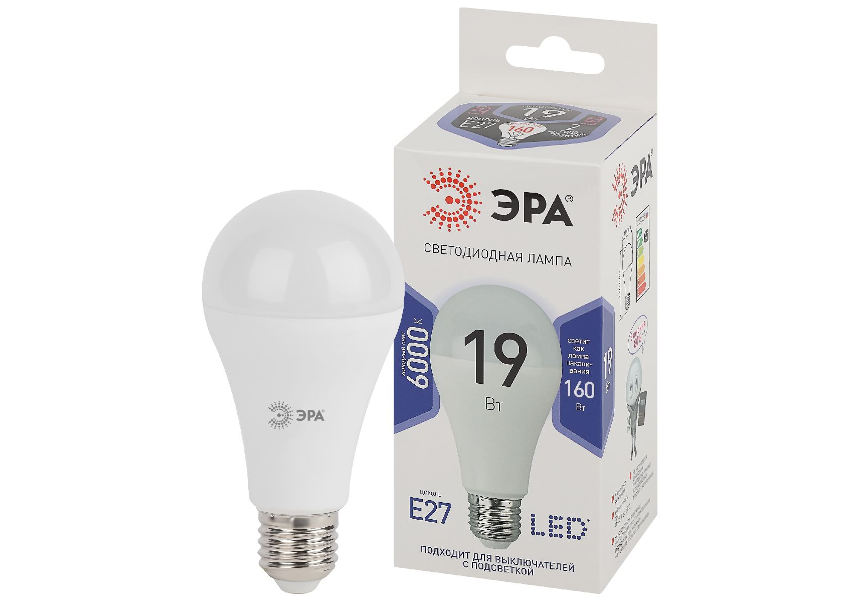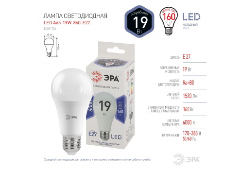 Лампа светодиодная Эра E27 19W 6000K LED A65-19W-860-E27 Б0031704